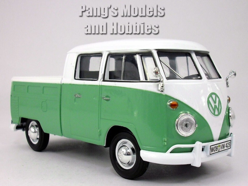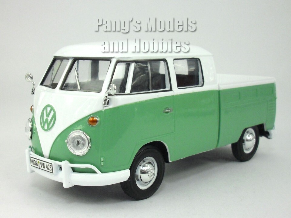 1963 Volkswagen Classical T1 Type 2 Bus Pickup. 1:24 scale diecast collectible model car. This 1962 VW Bus measures 6.75" long, 2.5" wide and 3" high. It has openable rear hatch. The seats/benches inside are visible and molded quite accurately. Hub cabs have the VW logo embossed and the tires are made of rubber. The headlights, side view mirrors and bumpers add nice and realistic details.