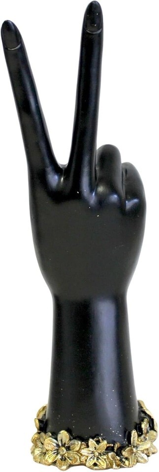 Decorative Peace Sign Hand Statue with black finish and gold rose accents