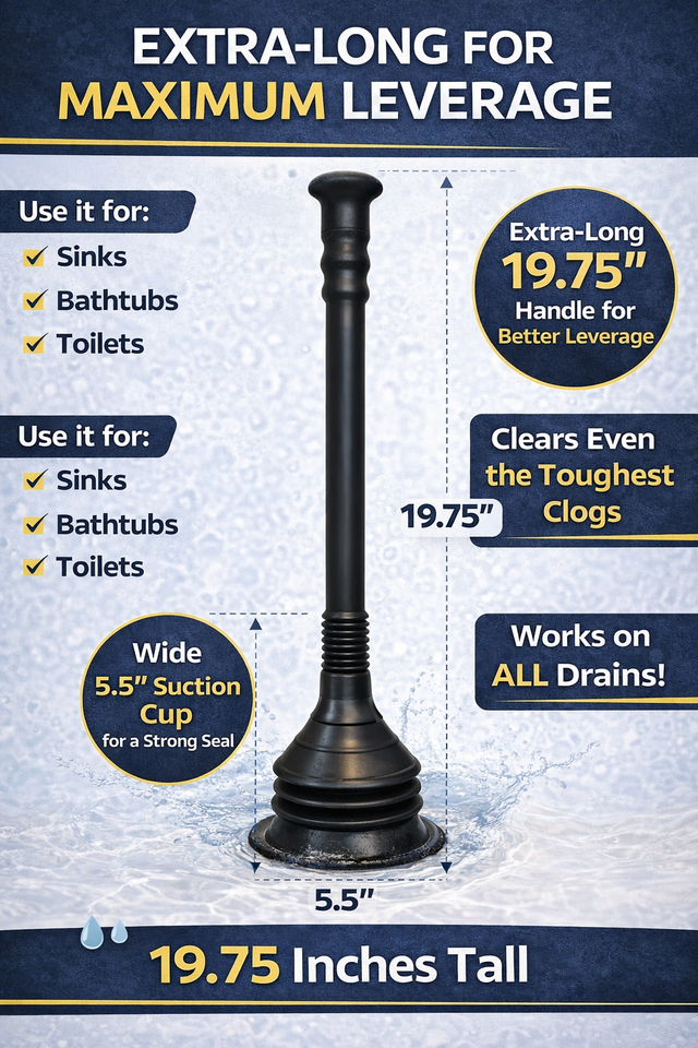 This accordion-style toilet plunger is designed for powerful plunging in toilets, shower drains, bathtub drains, and bathroom sinks. The flexible bellows design builds pressure where clogs form, while the extra-long handle provides better reach and control during use.