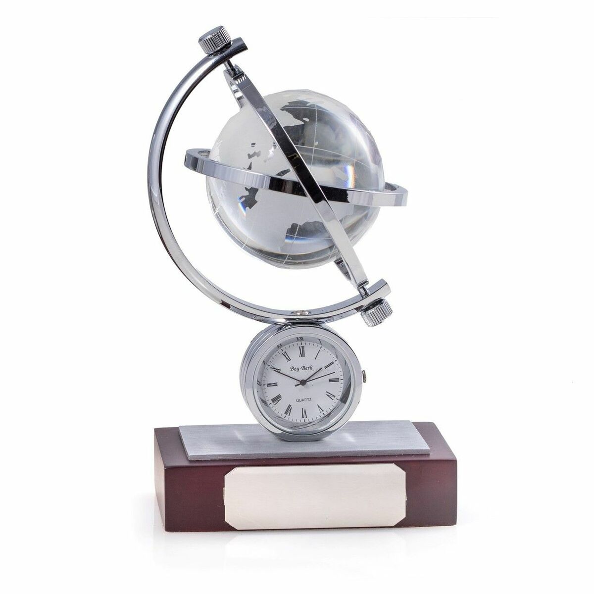 Bey Berk Austin"Globe Gyro Quartz Clock with Chrome Accents on Mahogany Base