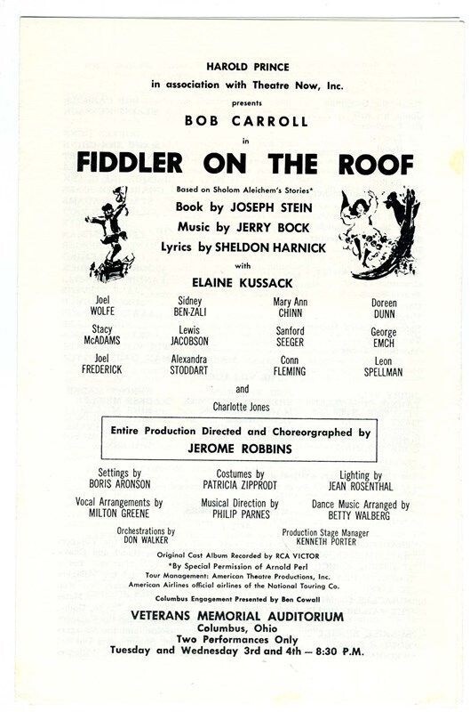 A Souvenir program and performance program from Fiddler on the Roof, starring Bob Carroll, with Elaine Kussack and Charlotte Jones. The Souvenir Program has 16 pages filled with photos and information on the cast, crew and production. In fine condition. The performance program is a 6 panel fold out in fine condition. From a performance at The Veterans Memorial Auditorium in Columbus, Ohio