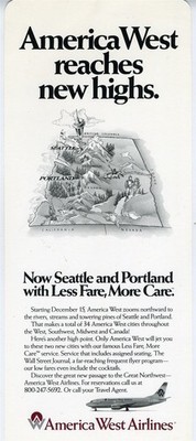 A large 2 sided America West Las Vegas Portland Seattle Seat Back Advertising Card dated 1986. with Information and route map for Nonstop Nite Flites to Las Vegas on one side and A pictorial map and information on new routes ot Seattle and Portland on the other side. In fine condition, measures about 5" x 12".