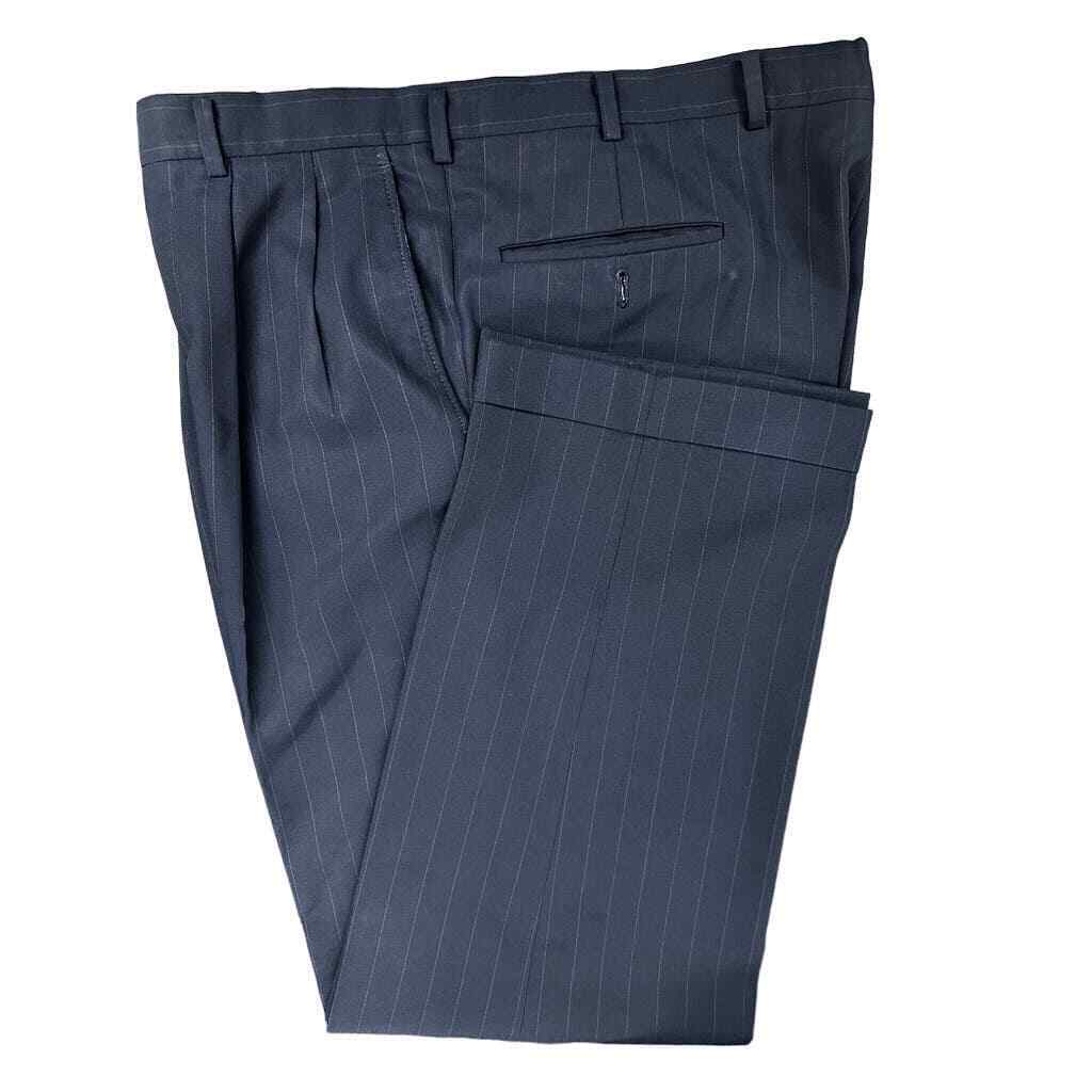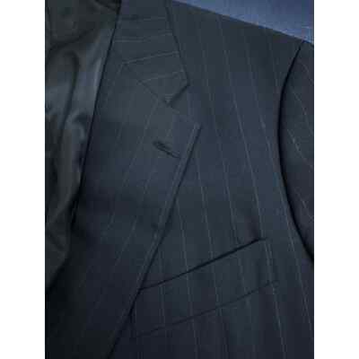 This Hickey Freeman Navy Blue Pinstripe Suit is a must-have for anyone looking for a stylish and sophisticated outfit. Made of pure wool, it features shoulder pads, a notch collar, a satin lining (with a slight tear at the back bottom), 2 buttons, 3 interior pockets, and 2 exterior pockets. The suit is in perfect condition on the outside, and I had it dry cleaned before noticing the satin lining is coming apart at the seams under the arms and is ripped at the top of the vent. Can be repaired or use as a costume- it was a $2000 suit!