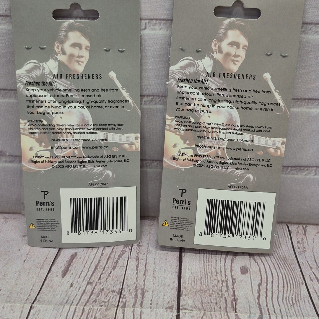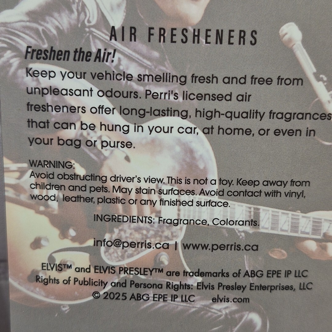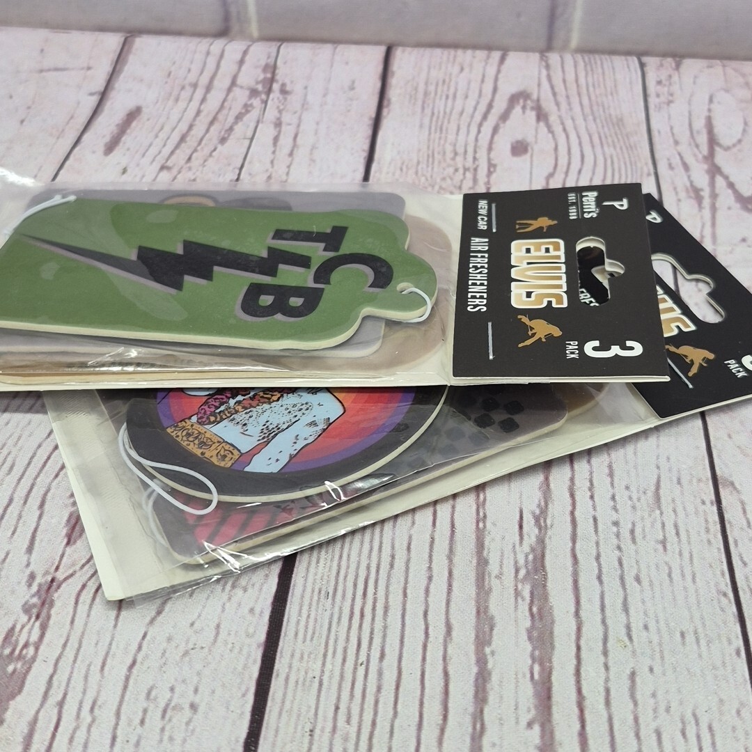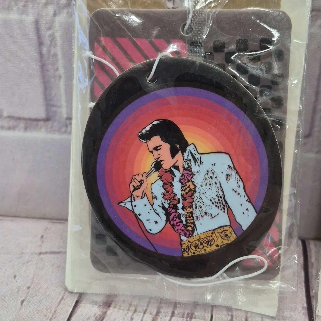 This product is a set of two packs of Elvis Presley air fresheners, totaling six units. Each pack is sealed and brand new, making them a great addition to any Elvis Presley fan's collection. With the iconic rock and pop artist's name attached to the product, these air fresheners are sure to evoke feelings of nostalgia and appreciation for Elvis Presley's music and legacy.