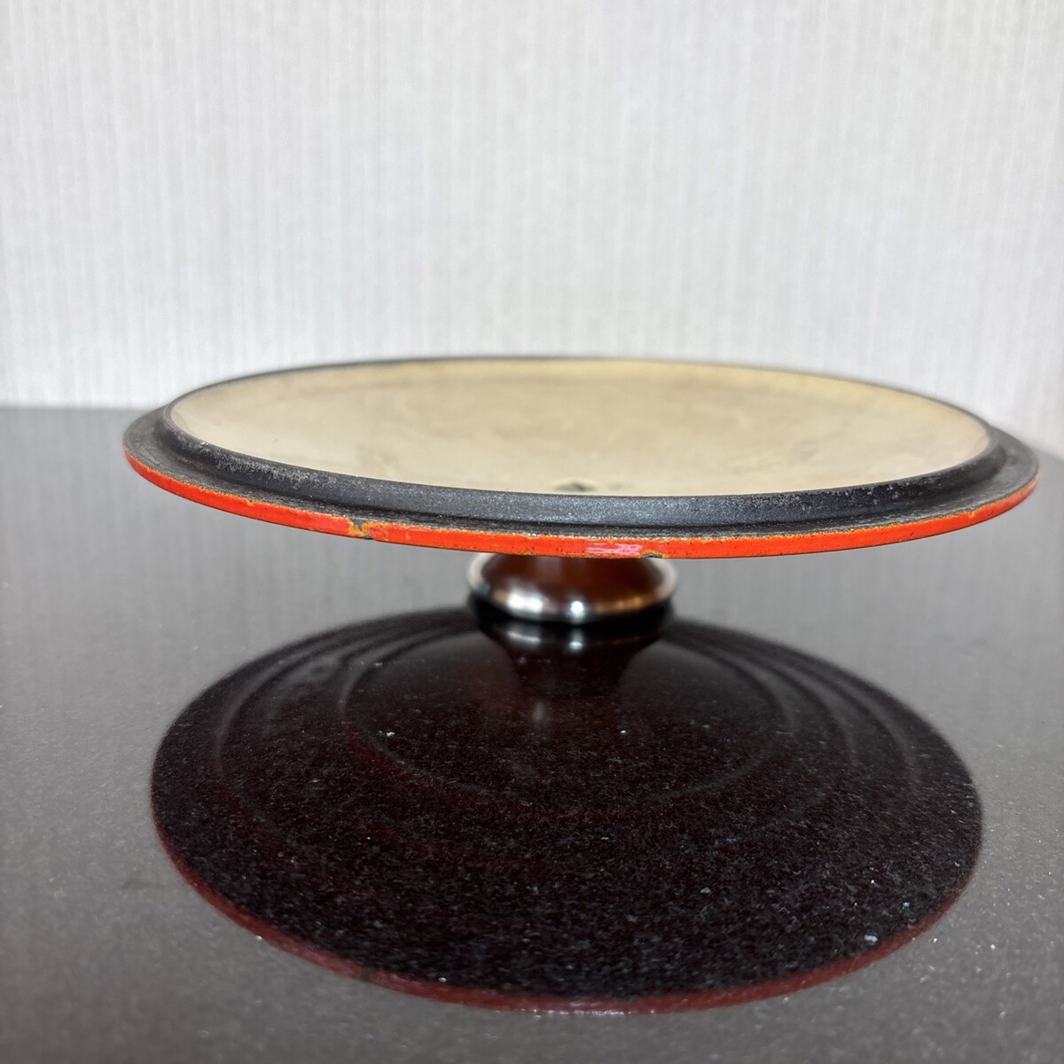 Shows wear from normal use with edge chips; no cracks, original stainless knob