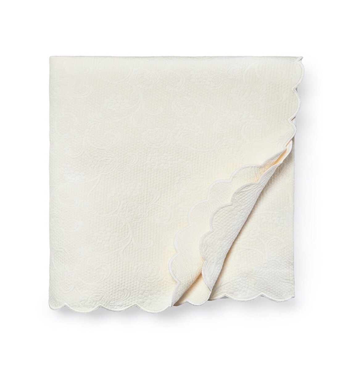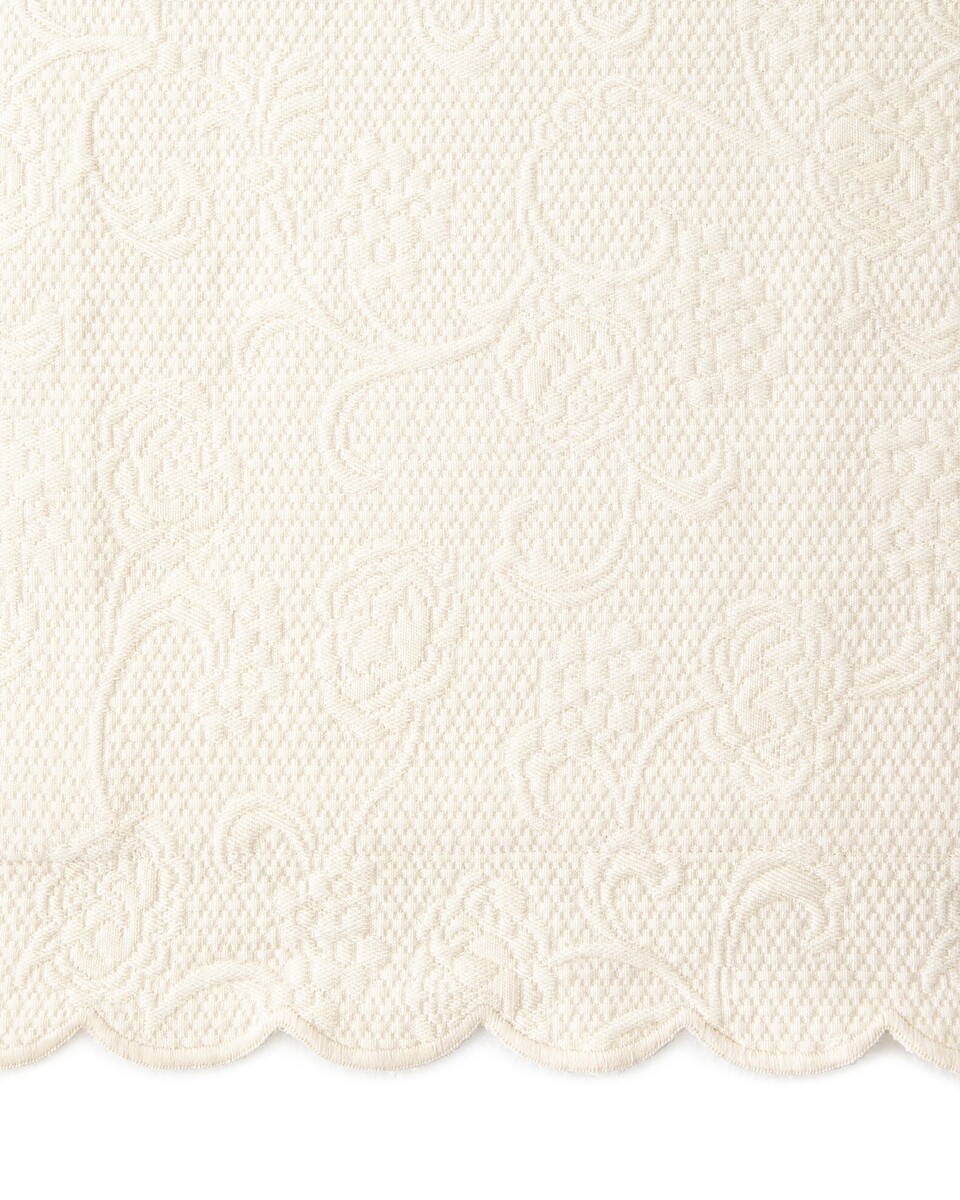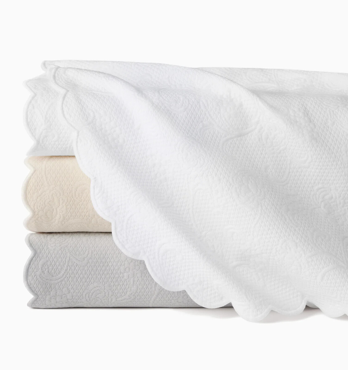 In the classic tradition of matelasses, a subtle raised pattern of flowers and vines is set against a textured ground, all woven from soft long-staple cotton. Scalloped edges finish the blanket covers and pillow shams