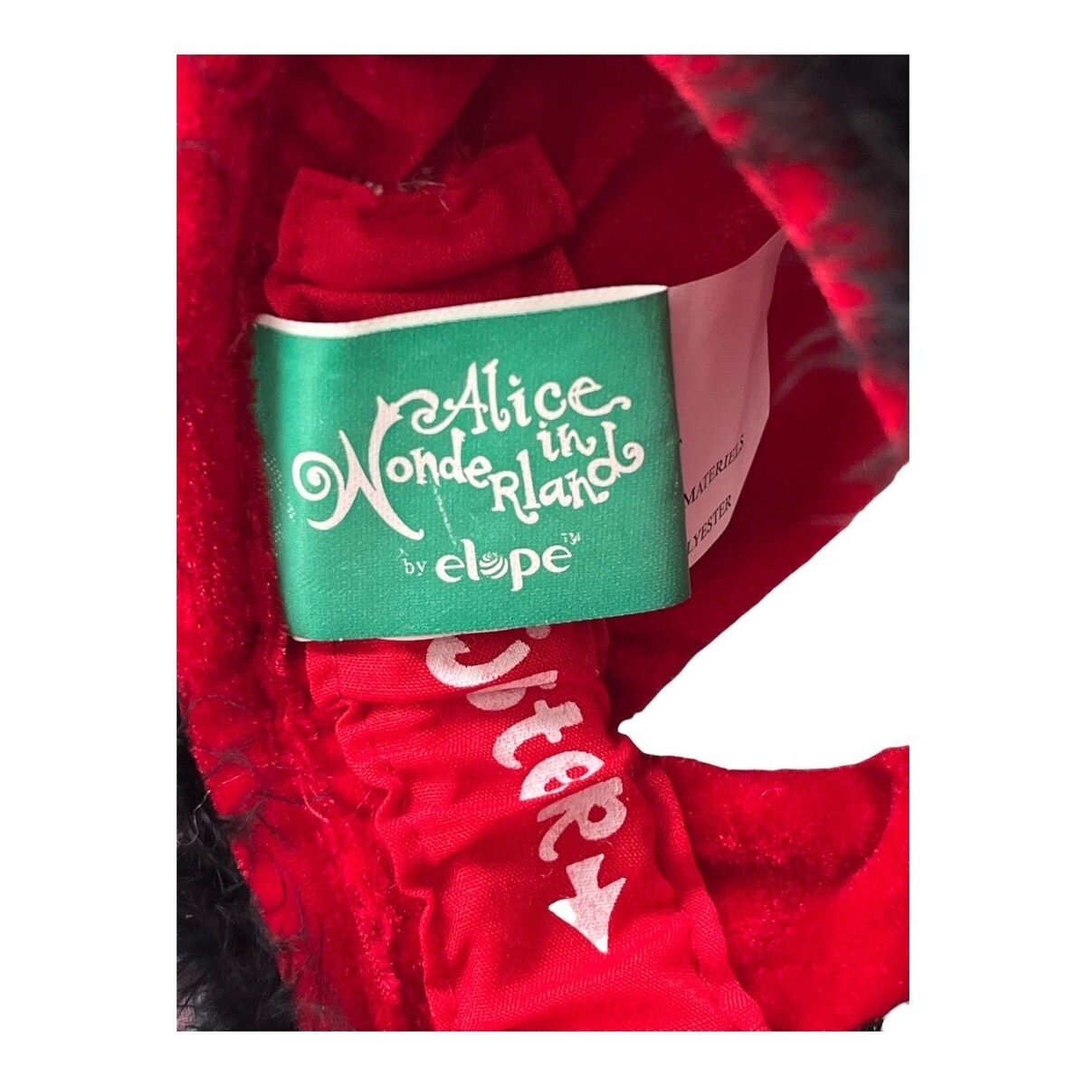 Vintage Alice in Wonderland jester-style crown headpiece by elope, featuring alternating red and black velvet panels with sculpted points and soft feather trim around the base. The bold, whimsical design reflects classic Wonderland costume styling and works well for cosplay, theatrical use, costume parties, or display. An interior adjustable strap helps secure the fit.