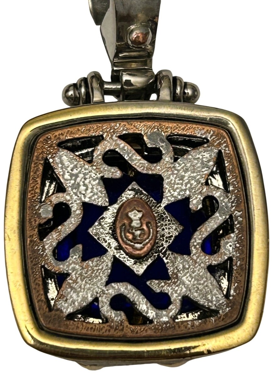 While pre-owned, this pendant is in great vintage condition. We did want to point out that there is a chip in the blue glass on the right top corner (see last image). This is not really noticeable when worn but can be seen when you examine the blue centerpiece closely. We have adjusted the pricing to account for this imperfection.