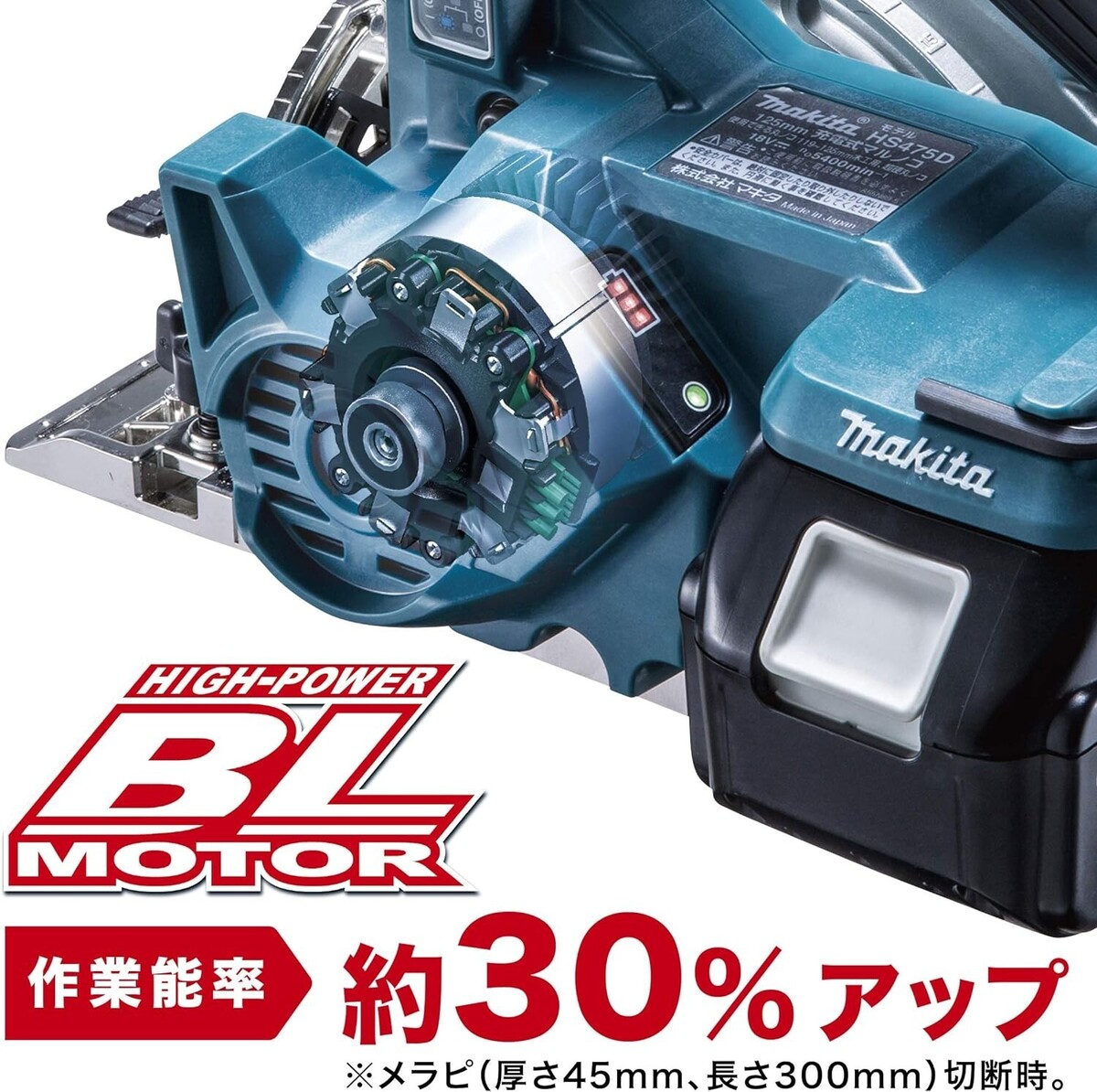 Work capacity per charge (approx. with BL1860B): approx. 390 pieces (2x10 material, 38 mm thick x 235 mm wide). 18 V, sliding Li-ion battery specification, battery and charger sold separately. Saw blade dimensions: outer diameter 125 mm, inner diameter 20 mm, chip saw: with sharkskin premium white chip saw. Maximum depth of cut: 47 mm (90), speed: 5,400 [rev/min].
