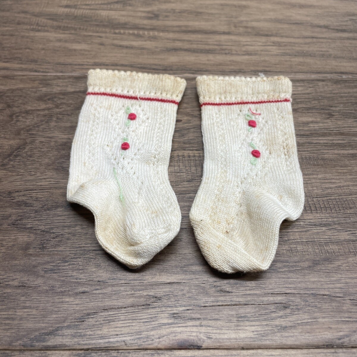 Misshapen due to storage and age. All shoes are yellowing and have spots. Leather moccasins have some red thread woven on one shoe. Please see pictures for details.