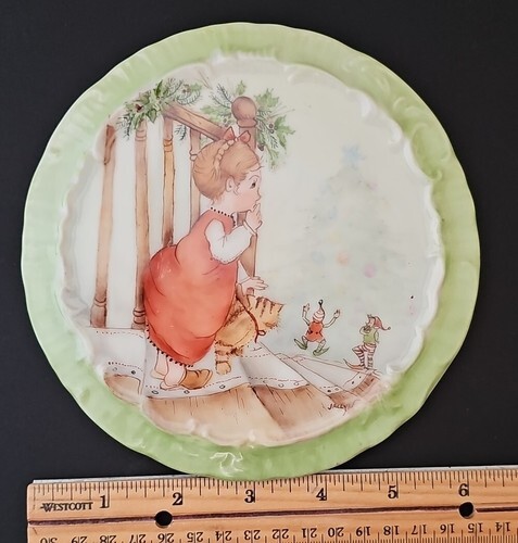This product is a vintage, hand-painted porcelain decor item featuring Christmas morning elves and a little girl. The item is 6 inches in size and is multicolored. It is made of ceramic and porcelain and is handmade in the United States. The product is ideal for home decor and is perfect for Christmas occasions.