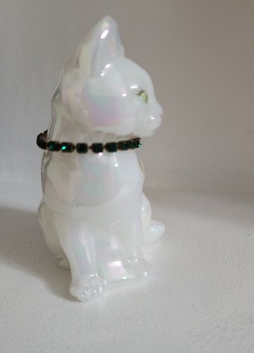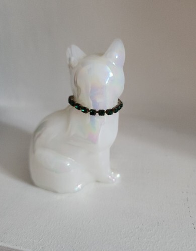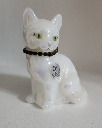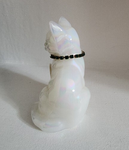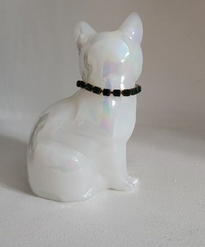Fenton Glass Cat Figurine Pearl White Opalescent Emerald Rhinestone Collar VTG