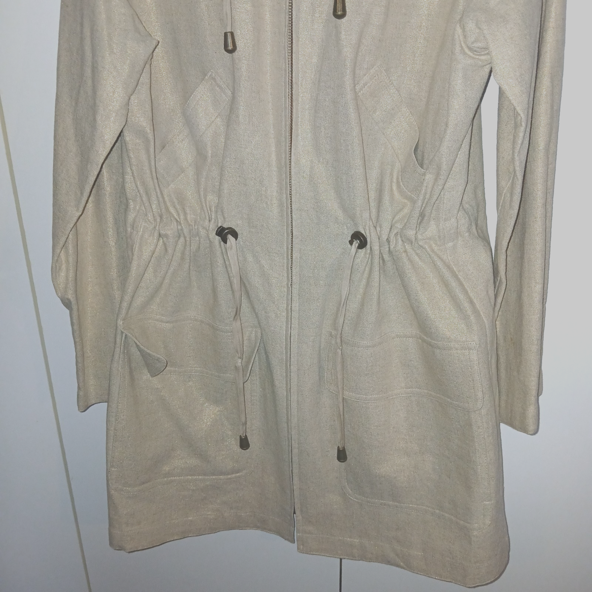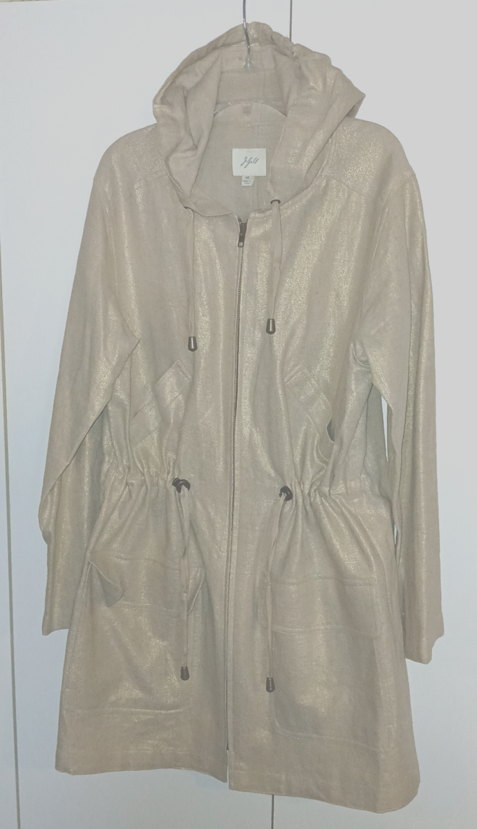 THIS IS A CUTE LADIES J. JILL METALLIC GOLD LIGHTWEIGHT LINEN/COTTON HOODED UTILITY COAT IN A SIZE XS. IT IS IN EXCELLENT, LIKE-NEW, CONDITION--WORN ONCE.