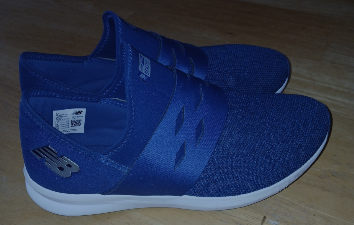 THIS IS A GREAT PAIR OF LADIES NEW BALANCE BLUE SLIP-ON FUEL CORE SPARK ATHLETIC SHOES IN A SIZE 11. THEY ARE IN EXCELLENT, GENTLY WORN, CONDITION--MOSTLY JUST INDOOR WEAR.