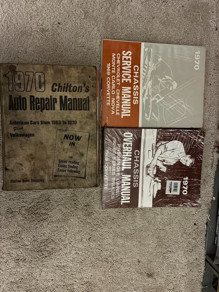 1970 1970 Chevrolet Corvette Camaro Nova Service Shop Set, uno dei manuali e una ristampa, e il manuale Chiltons