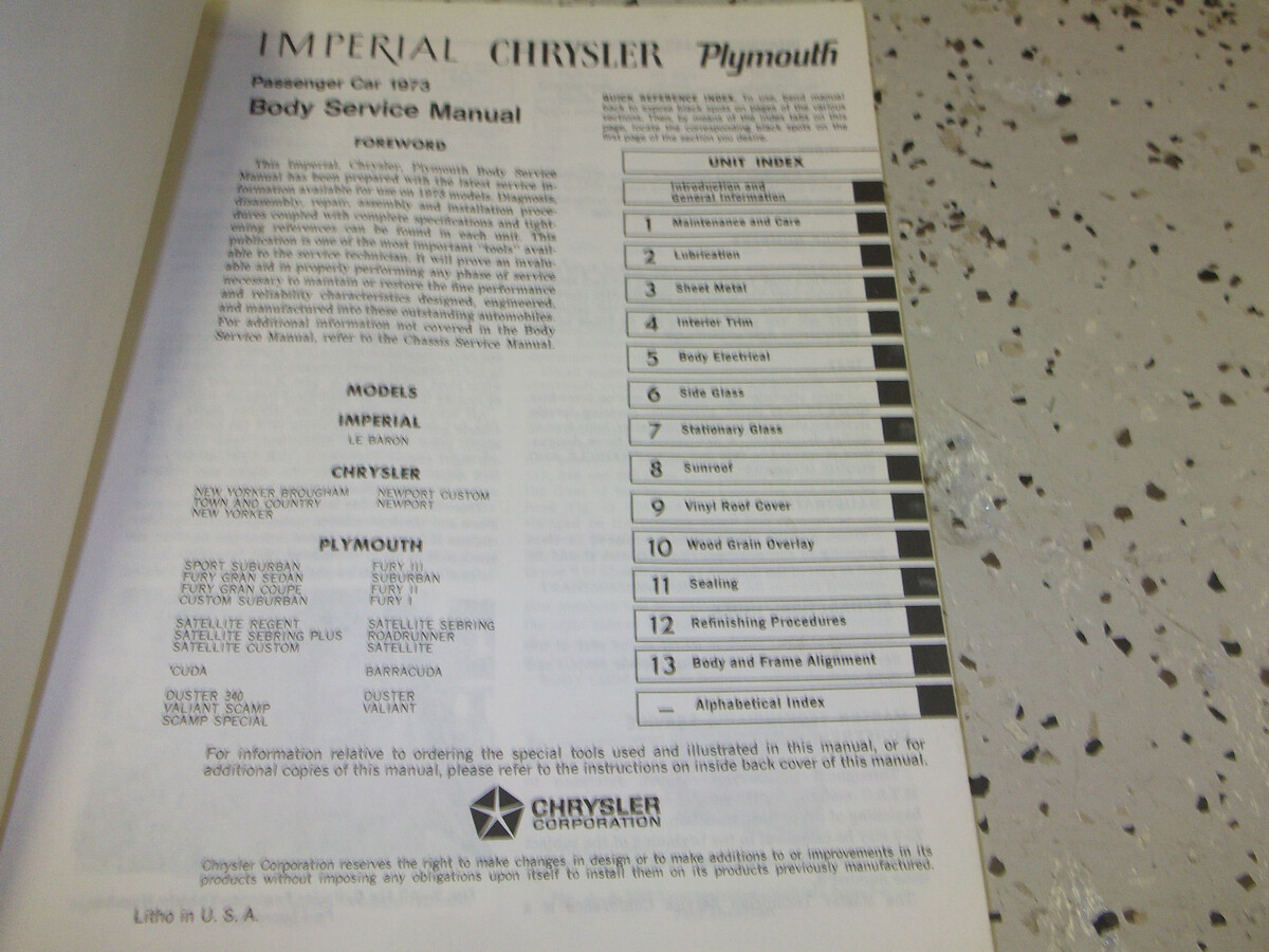 Manuale Di Riparazione Del Corpo Chrysler Imperial Plymouth 1973 OEM FABBRICA 73