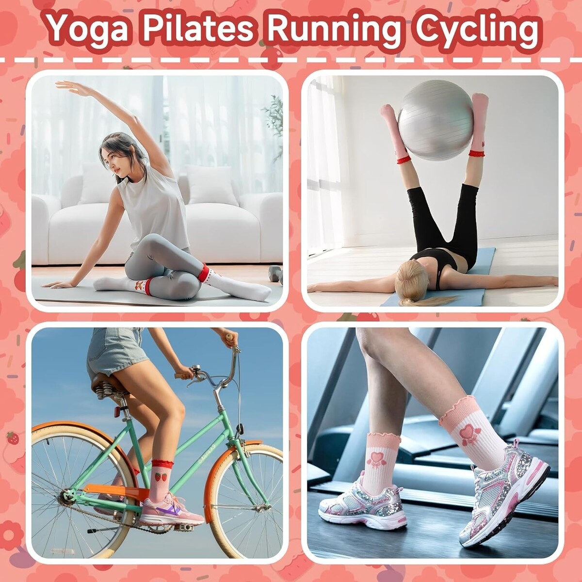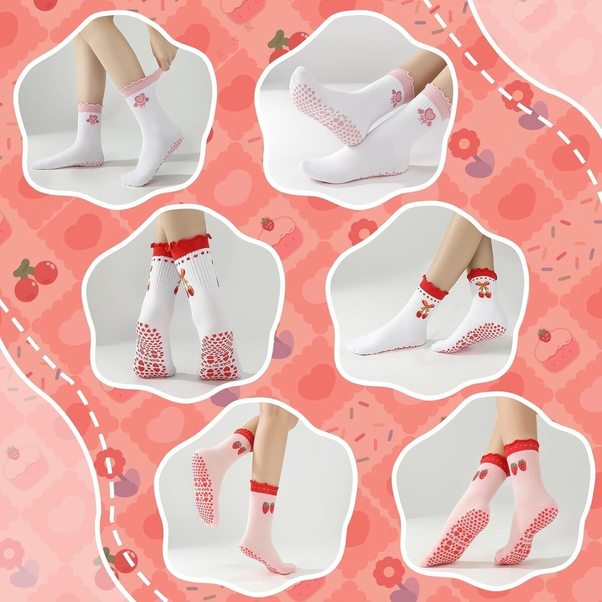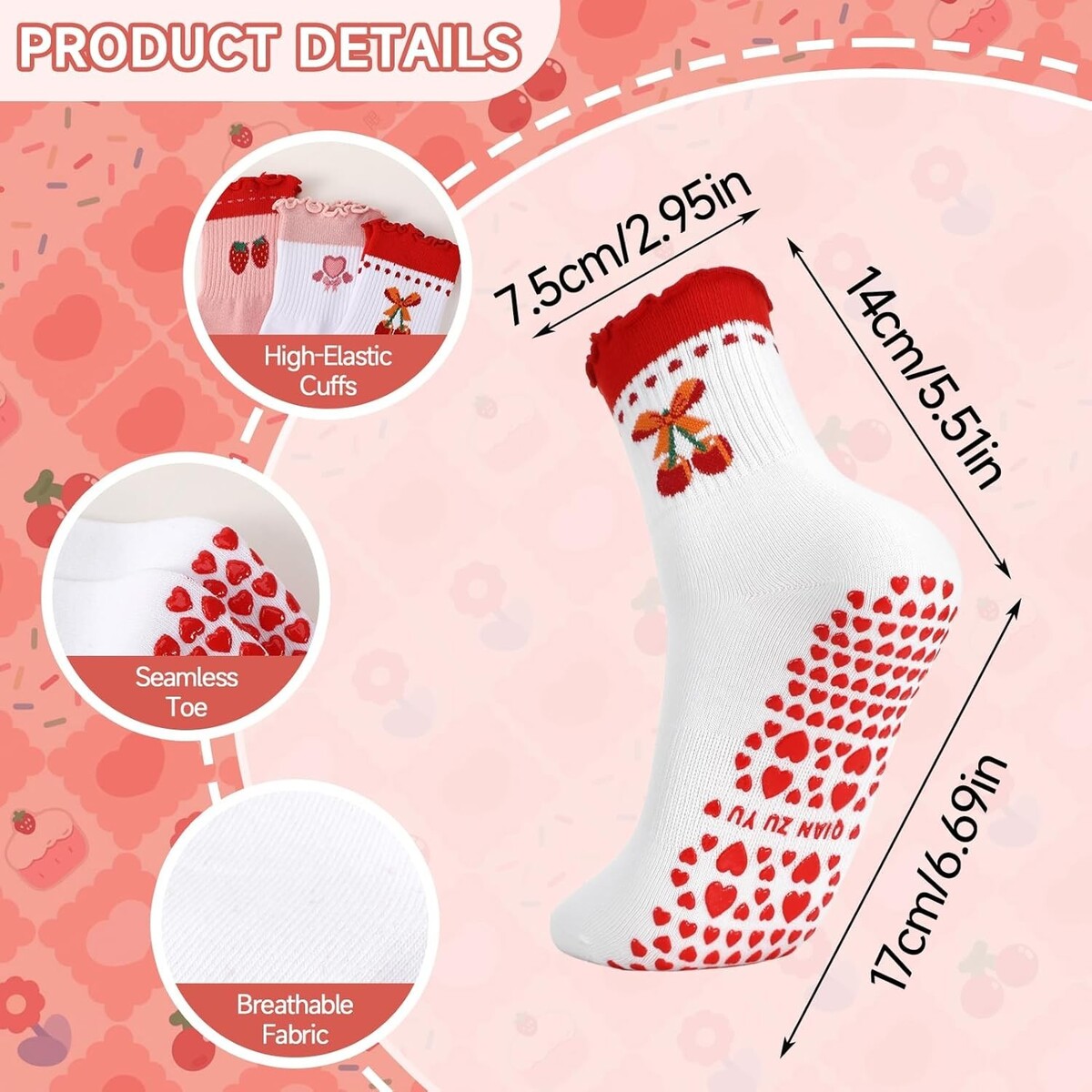 Charming Aesthetics: Adorned with cute ruffles along with playful strawberry, cherry, and bow designs, our socks add a touch of whimsy to your Pilates routine and everyday attire.