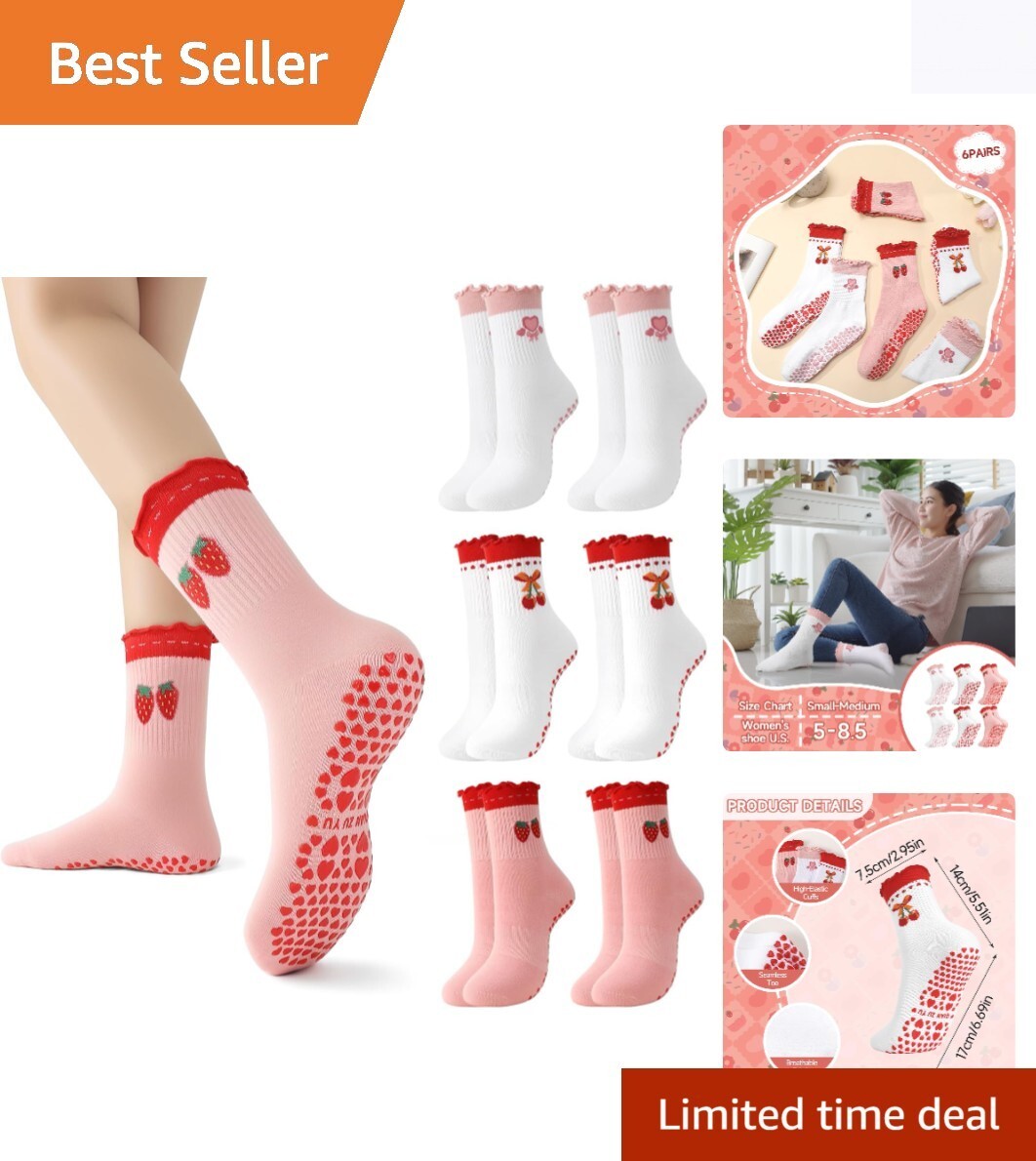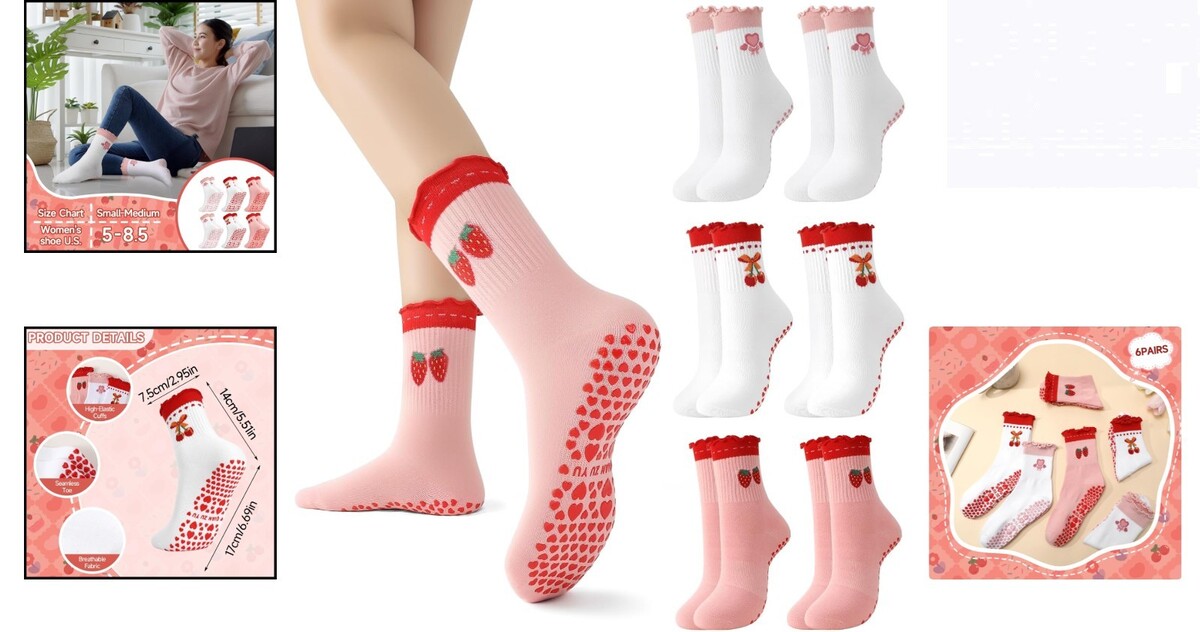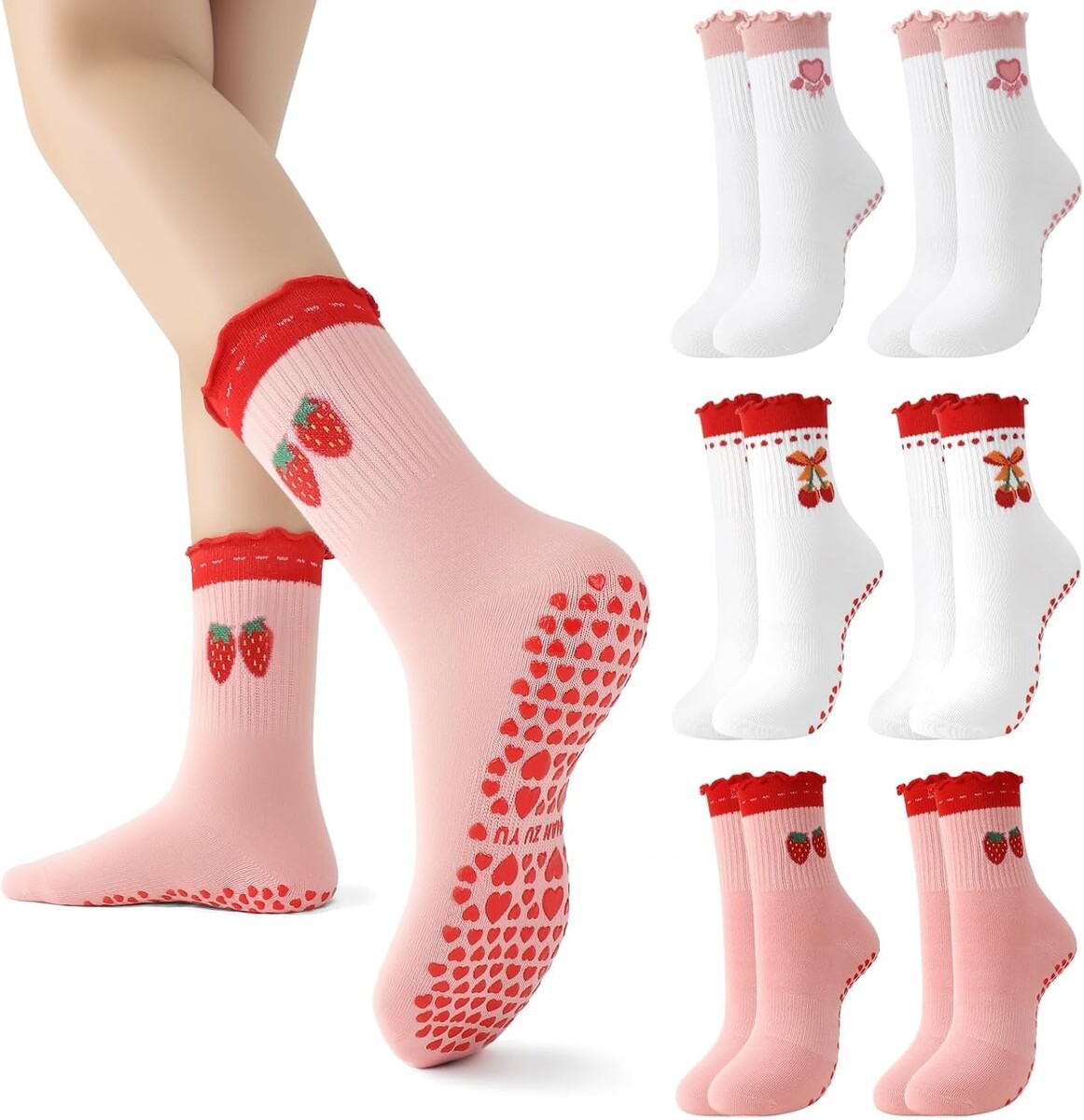 Charming Aesthetics: Adorned with cute ruffles along with playful strawberry, cherry, and bow designs, our socks add a touch of whimsy to your Pilates routine and everyday attire.
