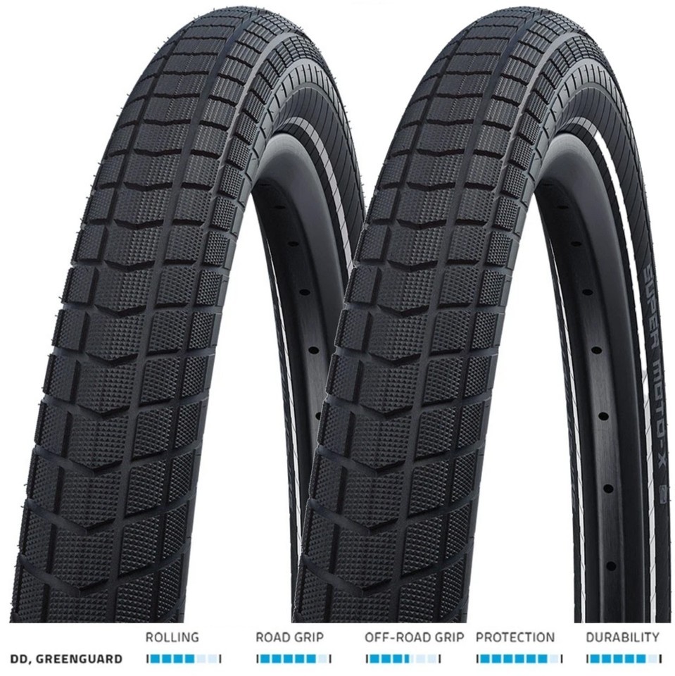 LOT of 2 Brand new, unused Schwalbe Super Moto-X 20-Inch Performance Line tire, featuring the superior DoubleDefense (DD) and GreenGuard puncture protection. This is the ultimate comfort and safety tire upgrade for high-speed E-Bikes, recumbent bikes, fat tire bikes, folding bikes, and cargo bikes. It's ready to handle heavy loads and fast commutes.