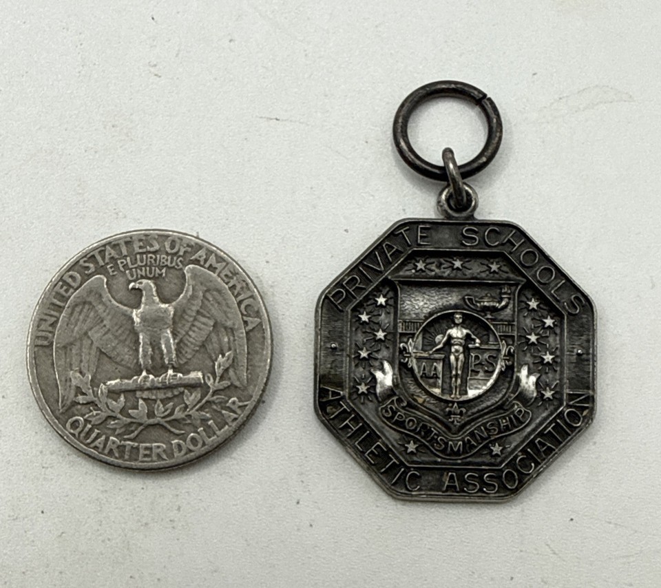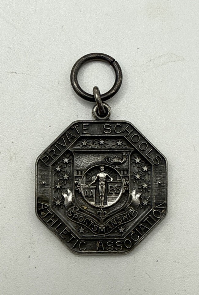 The Antique 1943 Dieges Clust Sterling Silver Volley Ball Medal is a rare and collectible piece of sports memorabilia from the United States. Made of sterling silver and weighing 10 grams, this unique medal celebrates the spirit of sportsmanship with a design featuring the Private School Athletic Association. The back is engraved indicating the sport of volleyball and 1943 as the year.