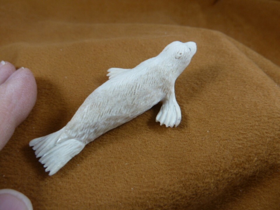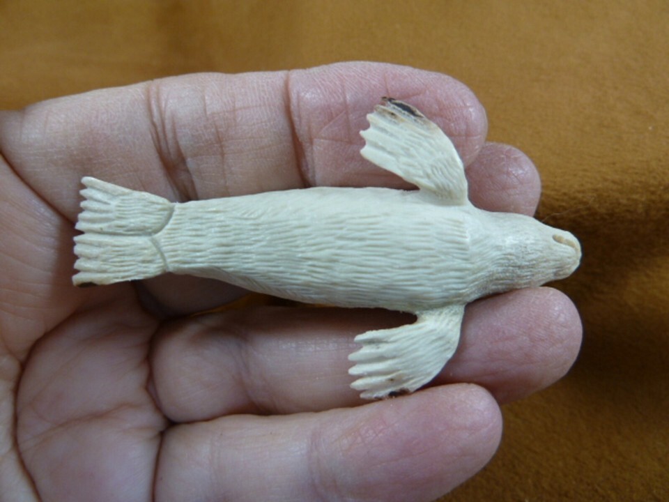 SEAL-w12) little white swimming Seal shed ANTLER figurine Bali detailed carving