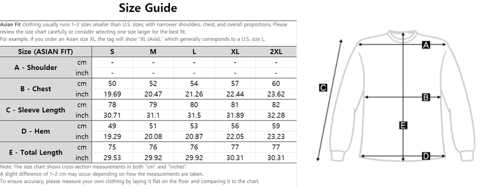 Asian Fit refers to clothing tailored for body shapes commonly found in Asian populations. These items typically run 1-2 sizes smaller than U.S. sizes, with narrower shoulders, chest, and overall proportions. Please check the size chart carefully or consider sizing up for the best fit.