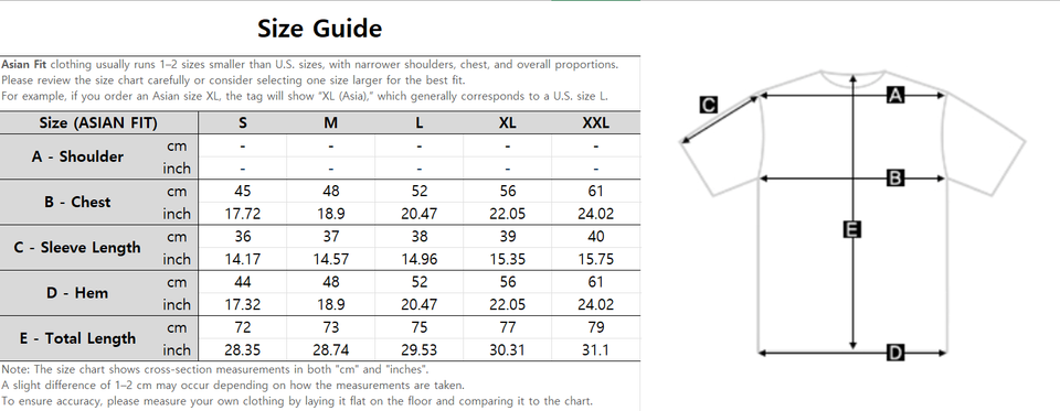 Asian Fit refers to clothing tailored for body shapes commonly found in Asian populations. These items typically run 1-2 sizes smaller than U.S. sizes, with narrower shoulders, chest, and overall proportions. Please check the size chart carefully or consider sizing up for the best fit.