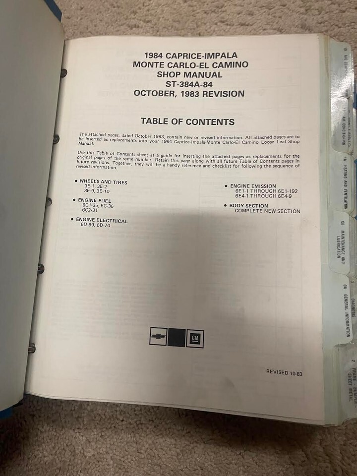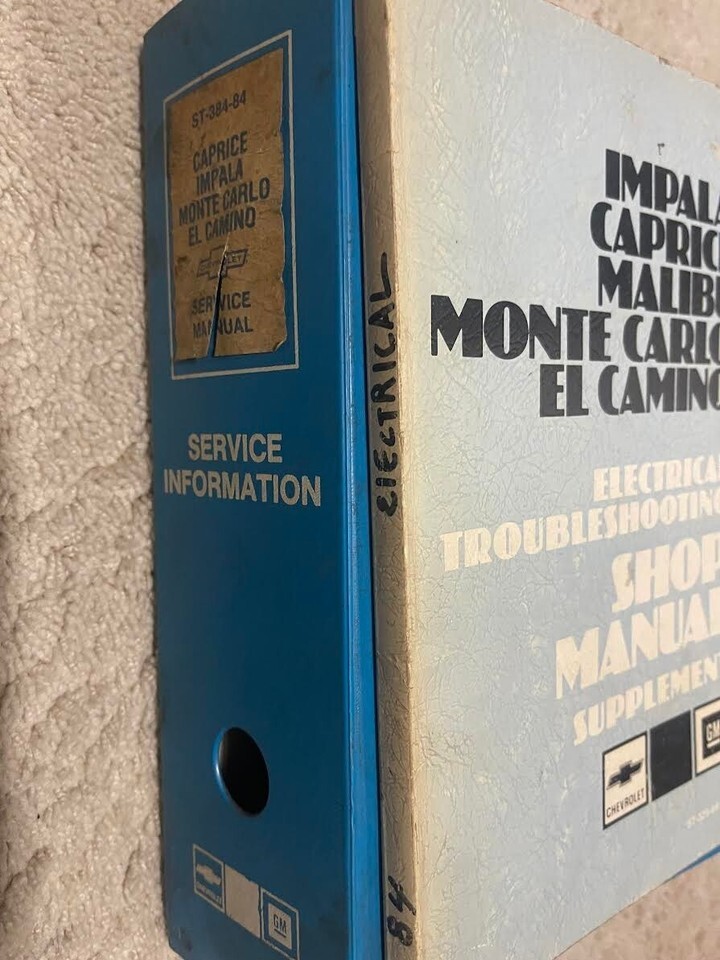 1984 GM FACTORY EL-CAMINO/MONTE CARLO/CAPRICE/IMPALA/MALIBU SERVICE MANUEL D'ATELIER DE REPARATION DANS Binder ET MANUEL DE DEPANNAGE ELECTRIQUE