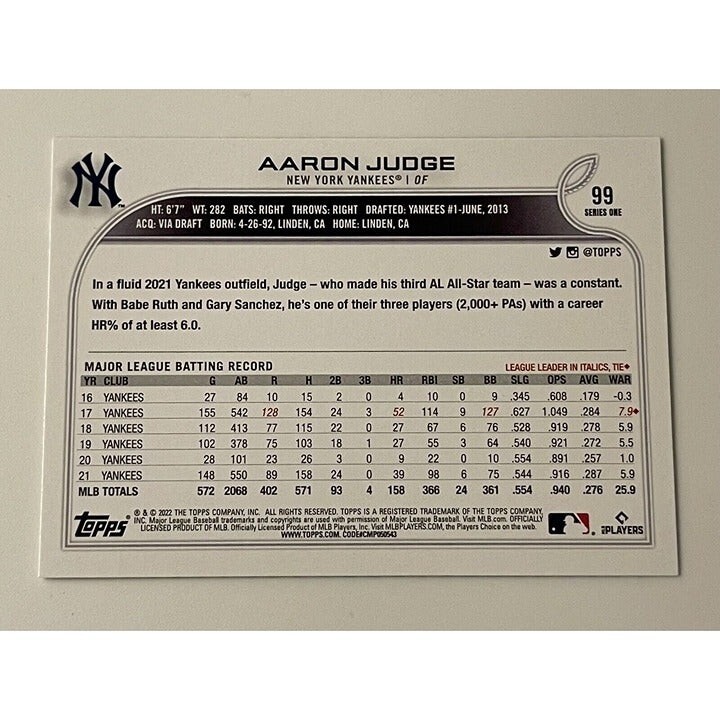 2022 Topps Series One Aaron Judge #99 Mlb Ny and 50 similar items