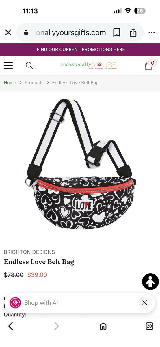 Brighton Endless Love Belt Bag Black/White/Red Heart Print NWT WOW Besutiful $78