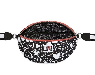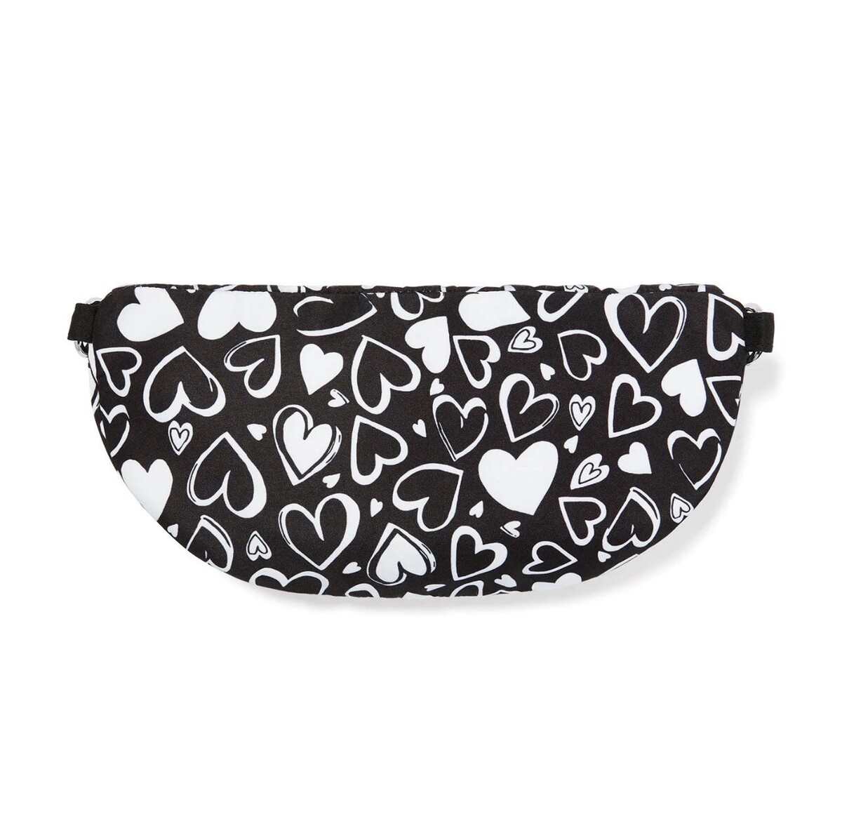 Brighton Endless Love designers Tom Clancy and Sasha Ramadan collaborated to create this belt bag featuring a black and white heart print with a contrast red zip closure. Crescent silhouette with an adjustable black-and-white nylon strap for wear as a belt bag or crossbody. Silver-tone hardware and fully lined interior in black fabric with white dot print.