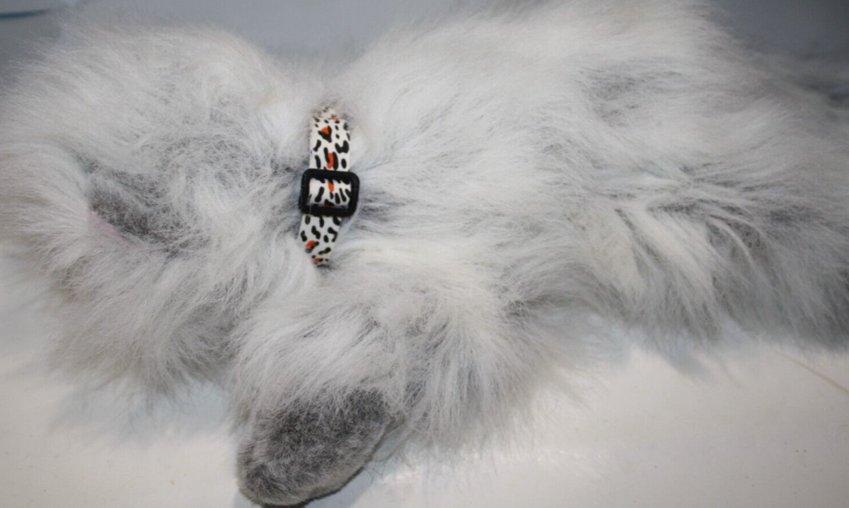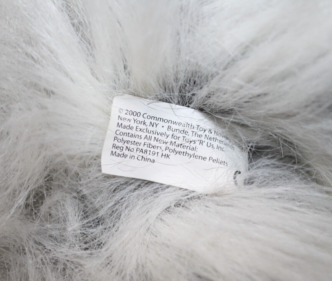 This beautiful kitty cat has long furry and short plush materials, Pretty Blue plastic eyes and pink cloth nose, Soft and Cuddly stuffed with floppy legs and pellet weighted paws, Long furry tail, wearing a non-removable animal print collar, Seam tag intact, dated 2000