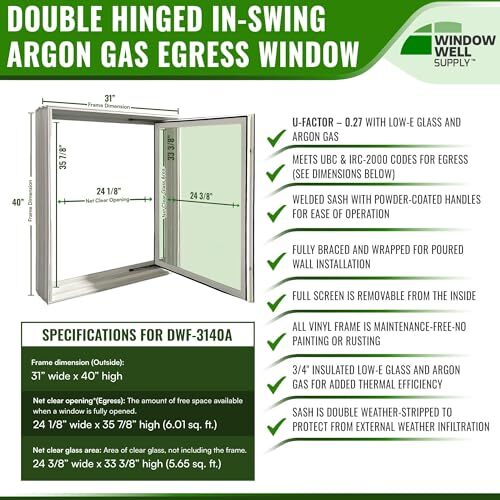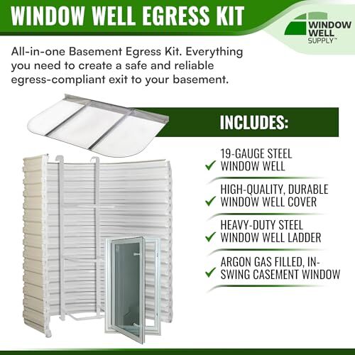 Bullet point: COMPLETE EGRESS WINDOW WELL KIT ? Our basement egress kit includes everything you need to meet or exceed IRC code requirements, ensuring your basement is safe and compliant. With window wells, covers, ladders, and windows, you can transform your basement into a secure living space effortlessly. Ideal for those looking for window well covers outside, basement window wells, and egress window well covers.