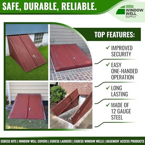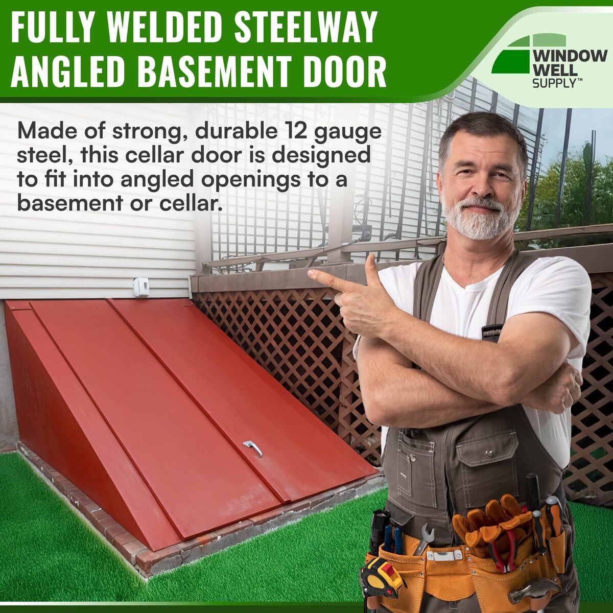 Made of strong, durable 12 gauge steel, this cellar door is designed to fit into angled openings to a basement or cellar. This adds security and protects the contents of the cellar from the elements and intruders.