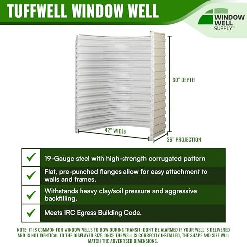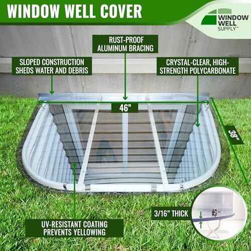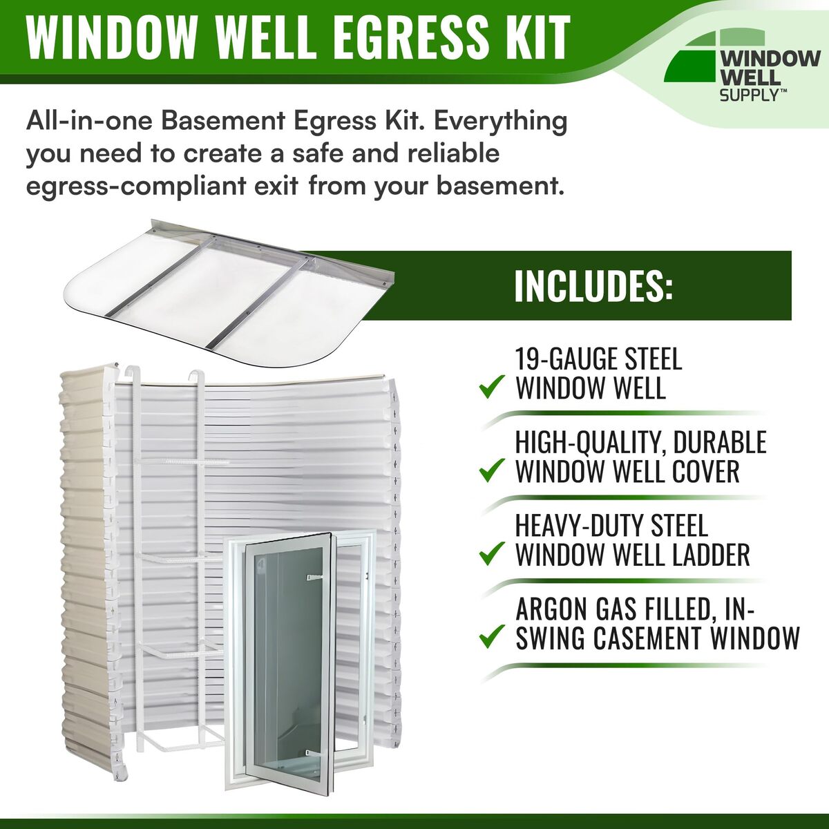 Bullet point: COMPLETE SAFETY SOLUTION FOR BASEMENTS: This comprehensive package includes 27 x 45 basement window, 42 x 36 x 48 window well, 3 Rung ladder, and 46 x 38 x 2 cover, ensuring full safety compliance for peace of mind. Our basement egress kit includes everything you need to meet or exceed IRC code requirements. Ideal for those looking for window well covers outside, basement window wells, and egress window well covers with a stylish home environment.