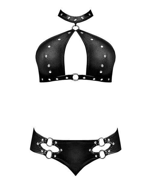 From the Lust Fetish collection by Magic Silk, this style includes: A choker bra featuring an open keyhole front, ring accents, a pressed together closure at the neck, clip closure in the back, and a matching cutout mini short with ring accents.