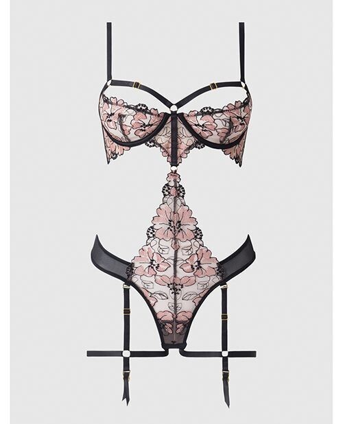 A one-of-a-kind monokini teddy exquisitely crafted in mesh and embroidered lace that glows under blacklight. Cleverly constructed with cutouts and panels to give your figure an hourglass shape. Enjoy a comfortable fit with the thong-back bottom that accentuates your curves. Features sheer wired cups and built-in thigh garters to tantalize. Ready to glow?