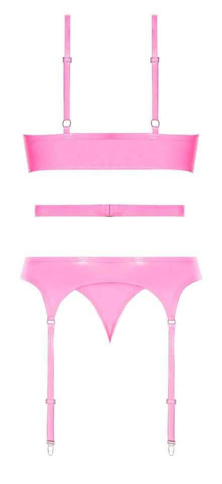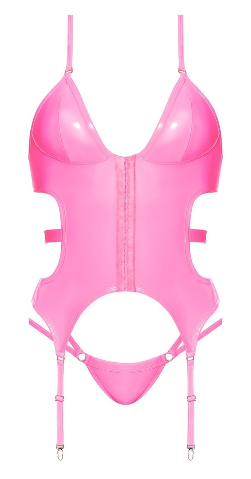 Club Candy Basque and Cheeky Panty Set Pink from Magic Silk Lingerie.From the Exposed by Magic Silk Collection, this style includes: a Basque featuring Corset style Hook and Eye Closures in the Front, a Waist Strap with Swan Hook Closure in the Back, Attached Garters and a matching Strappy Panty. Sweet Bubblegum Pink meets slick and slippery wet look fabric. Fabric content 55% Polyurethane, 40% Polyester, 5% Spandex. Care instruction: hand wash cold water. No bleach. Dry flat