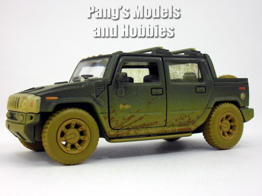 The 2005 Hummer H2 SUT at 1/40 scale by Kinsmart measures about 5 inches long by about 2 inches wide by about 2 inches high. It has very nice details such as separate clear plastic headlights, taillights, mirrors, grill, turn signals and even a spare tire.