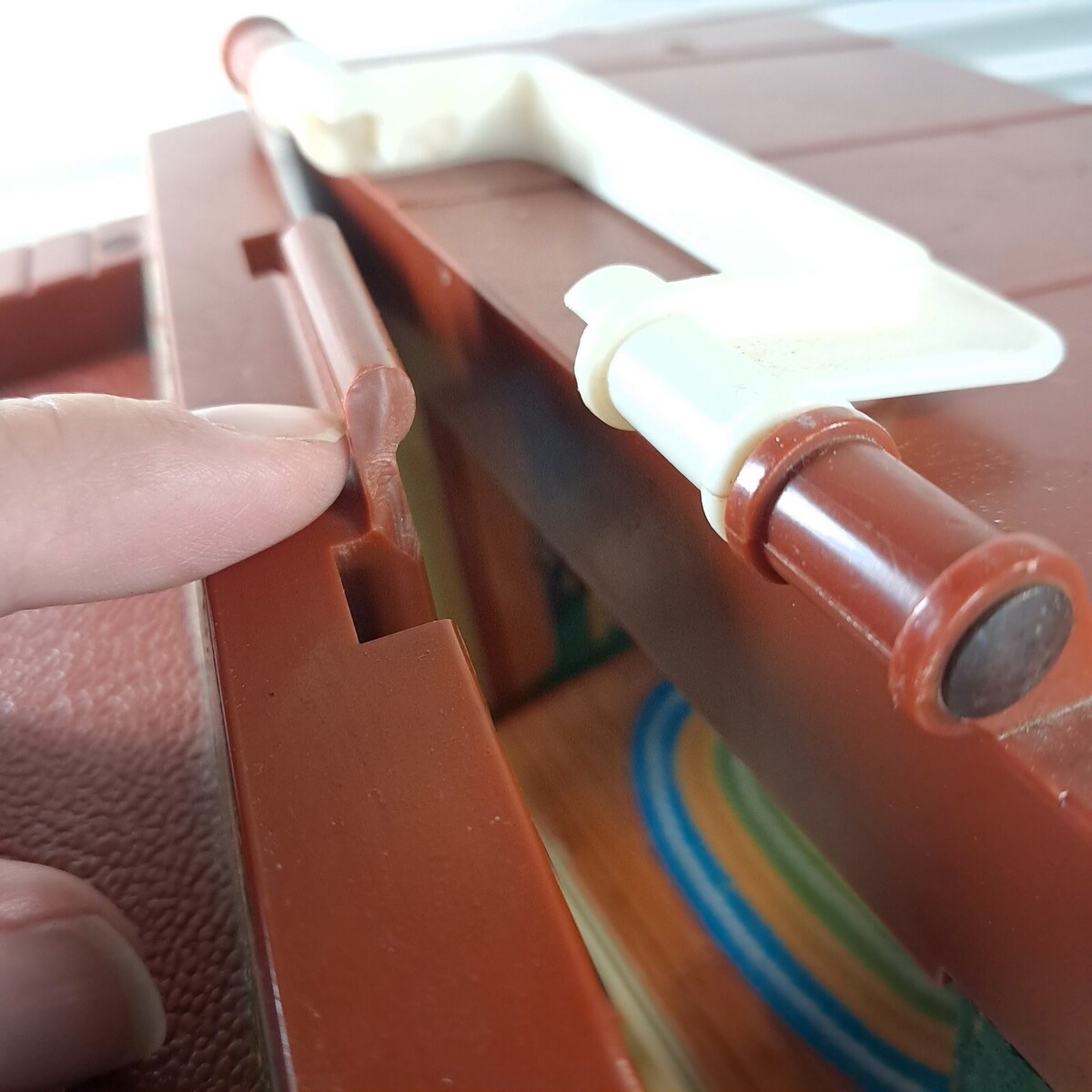 Does not latch at top as it's missing a piece. Paint wear/lots of sticker wear/missing stickers scuffs/scratches from use. Fair condition with lots of play wear. See pics for details measurements.