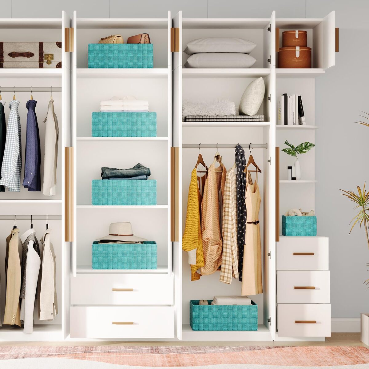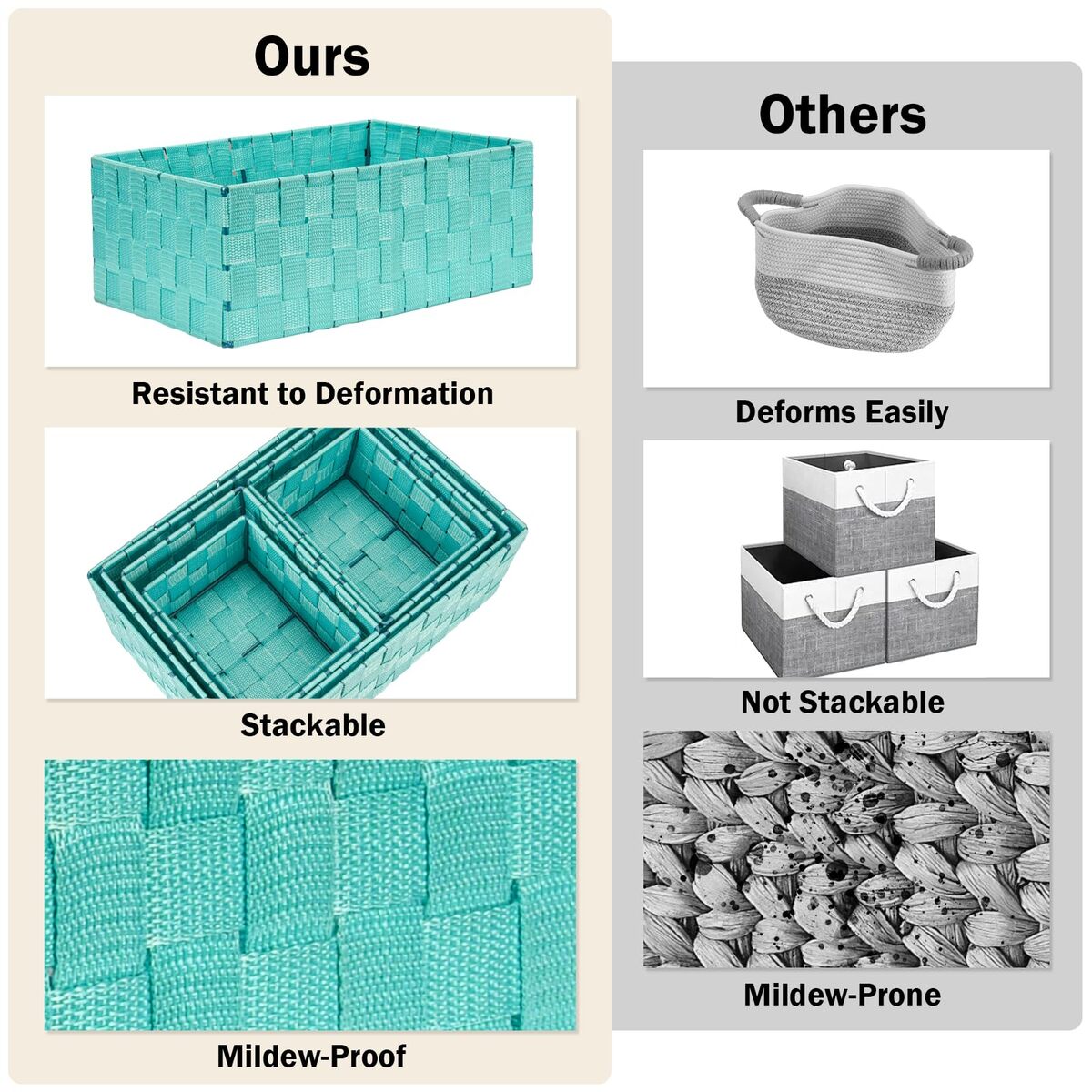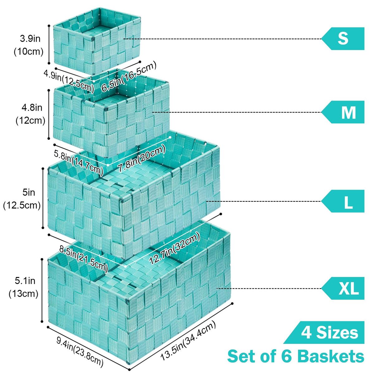 Set of 6 Baskets for Organizing : Multiple size baskets are suitable for different items, which are perfect in the drawer. It is strong and has enough section to put multiple options. Making your house or apartment feel a whole lot neater and cleaner. The baskets are packaged with paper box.,Soft Material Strong Frame: This desk organizer drawer is hand-woven with polypropylene yarn. The material has a sheen to it and it is surprisingly soft. Will not scratch items. At the same time, it has a hard metal fixed frame, Will not deform like cloth drawer, and has a longer service life.,Multiple Use Occasions: The different compartments fit your needs perfectly. As storage clothes, Craft, Child toy, Bedding, photo, pet toy, book and magazine, bathroom towel and toilet, collectibles, underwear/bra drawer, bedside drawer, cosmetic drawer storage and many other uses.,Versatile for All Space Storage : Used as a drawer divider or use each cube individually to store various related products. Decorative basket ideal for living room, bedroom, bathrooms, utility room, kids room, craft room, office, closet, kitchen, condos, laundry room, bar cabinet storage, toilet.,Set of 6 Containers Size: Measure about(LWH): 1 extra size: 13.5in x 9.4in x 5.1in; 1 large size: 12.7in x 8.5in x 5in ; 2 medium sizes : 7.8in x 5.8in x 4.8in; 2 small sizes :6.5in x 4.9in x 3.9in.