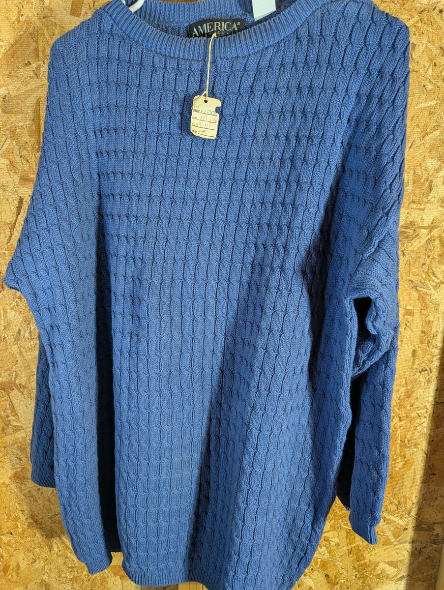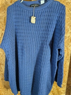 The America By Perry Ellis Medium Size Long Sleeve Sweater is a stylish and versatile addition to any man's wardrobe. Made from comfortable cotton material with a cable-knit texture, this solid blue sweater features a classic crew neck neckline and a pullover style. Perfect for travel, casual outings, or business settings, this vintage-inspired sweater is machine washable and designed for all seasons, making it a practical and fashionable choice for the modern man. Made in the United States by the renowned brand Perry Ellis, this sweater exudes quality and sophistication. 43" chest and 29" length
