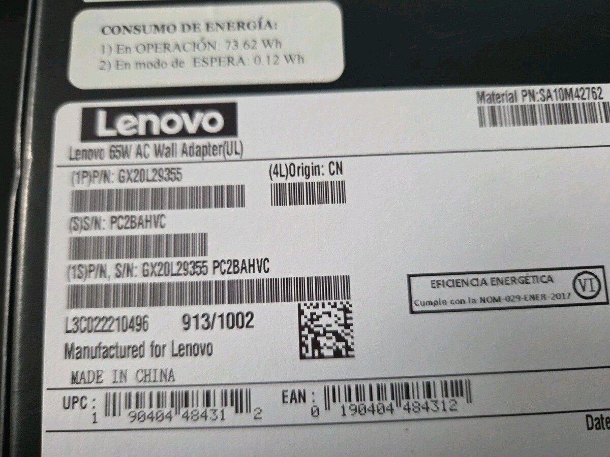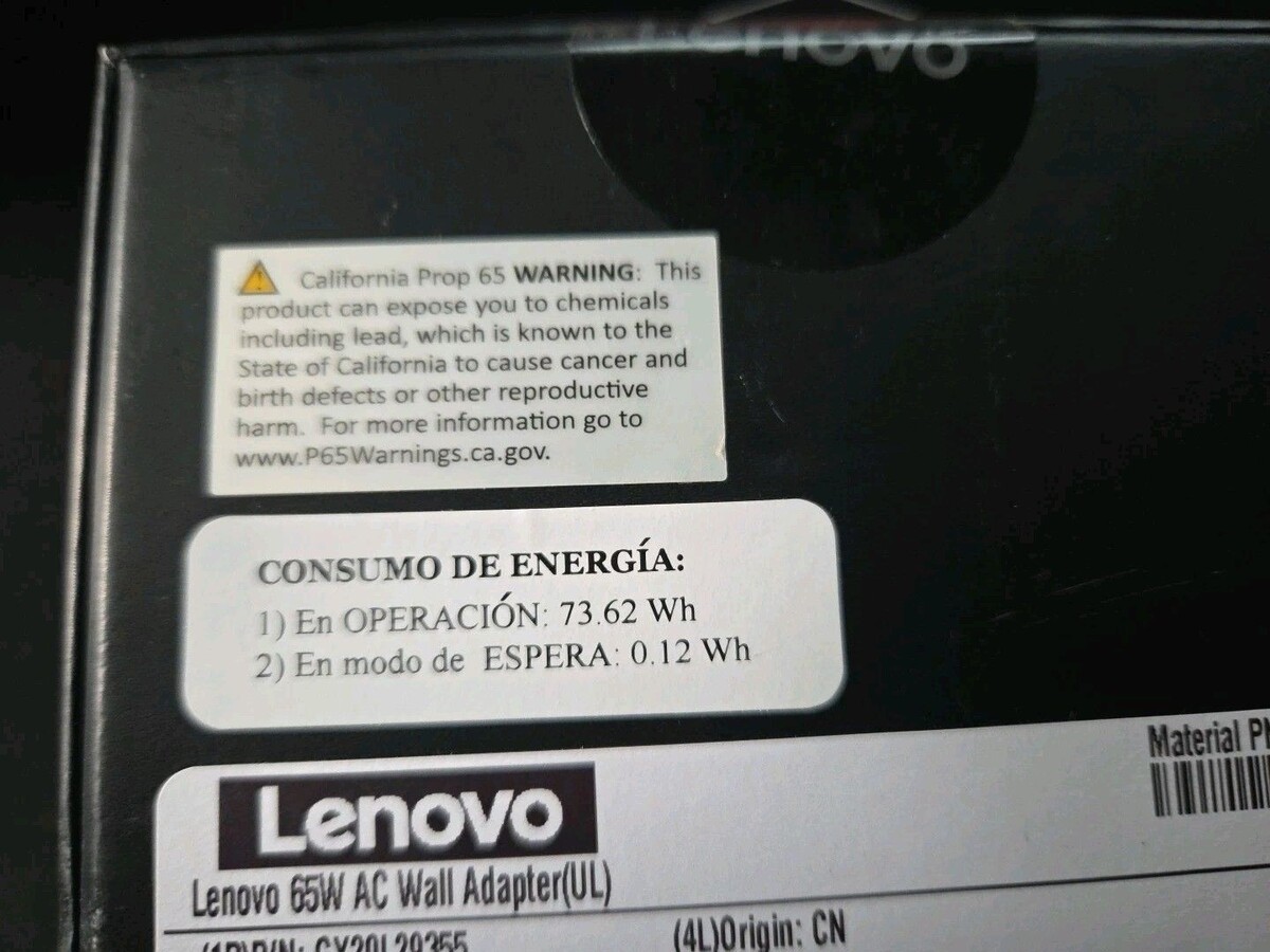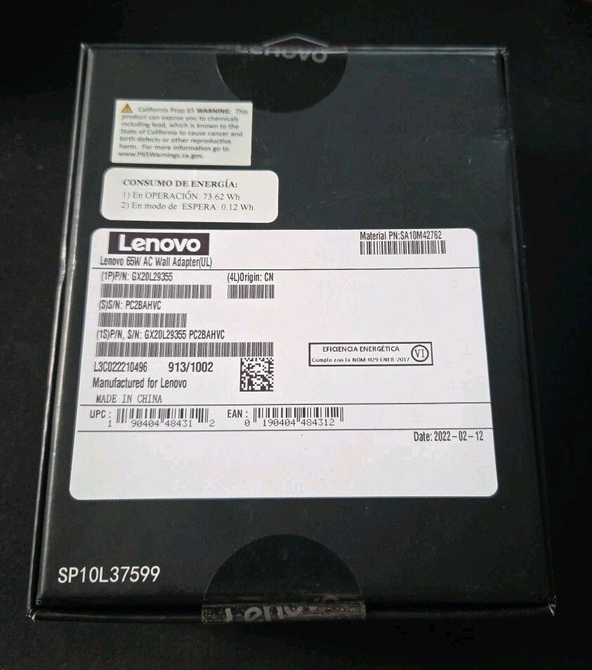 Lenovo 65W Laptop Charger - Round Tip AC Wall Adapter (GX20L29355) Black Sealed