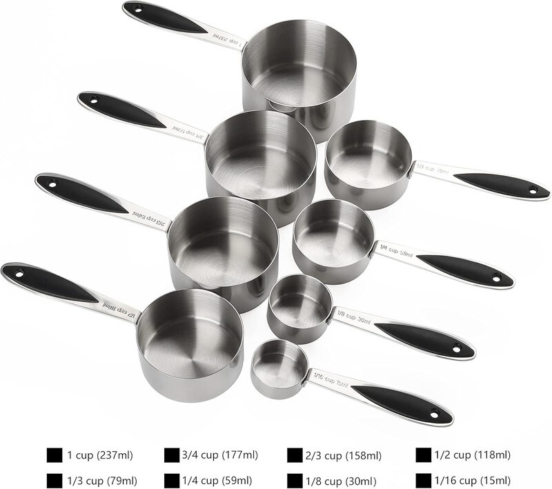 This comprehensive set includes 8 measuring cups?1 cup, 3/4 cup, 2/3 cup, 1/2 cup, 1/3 cup, 1/4 cup, 1/8 cup, and 1/16 cup?9 measuring spoons?1/16 tsp, 1/8 tsp, 1/4 tsp, 1/2 tsp, 3/4 tsp, 1 tsp, 1/2 tbsp, and 1 tbsp?plus 1 leveler. Made from high-quality stainless steel, this set is designed for durability and accuracy.