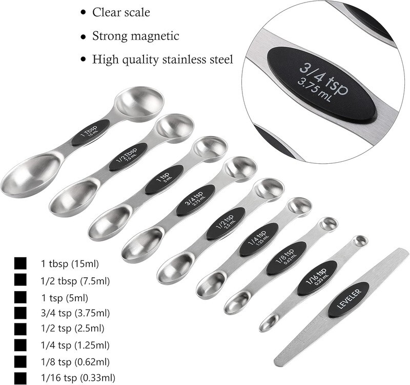 The measuring spoons feature a double-sided magnetic design, allowing them to stack neatly and stay together for easy storage. The magnetic force keeps the spoons aligned on countertops, preventing clutter after use. Both sides can be used for measuring dry or liquid ingredients, and the included leveler helps ensure precise measurements.