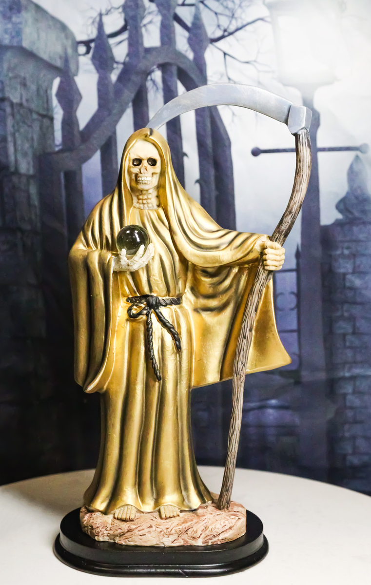 Gold Robe Santa Muerte With Scythe Patroness Of Wealth Decorative Figurine 12"H