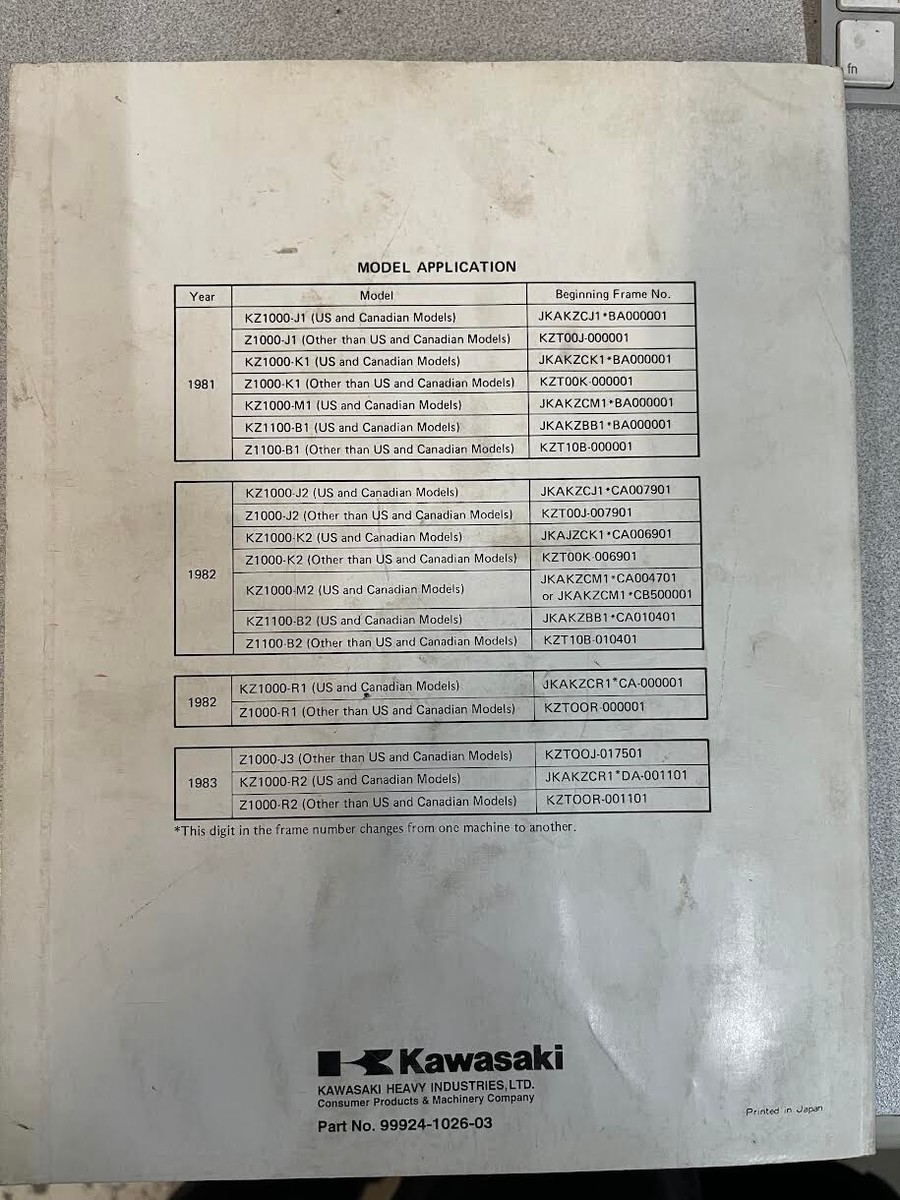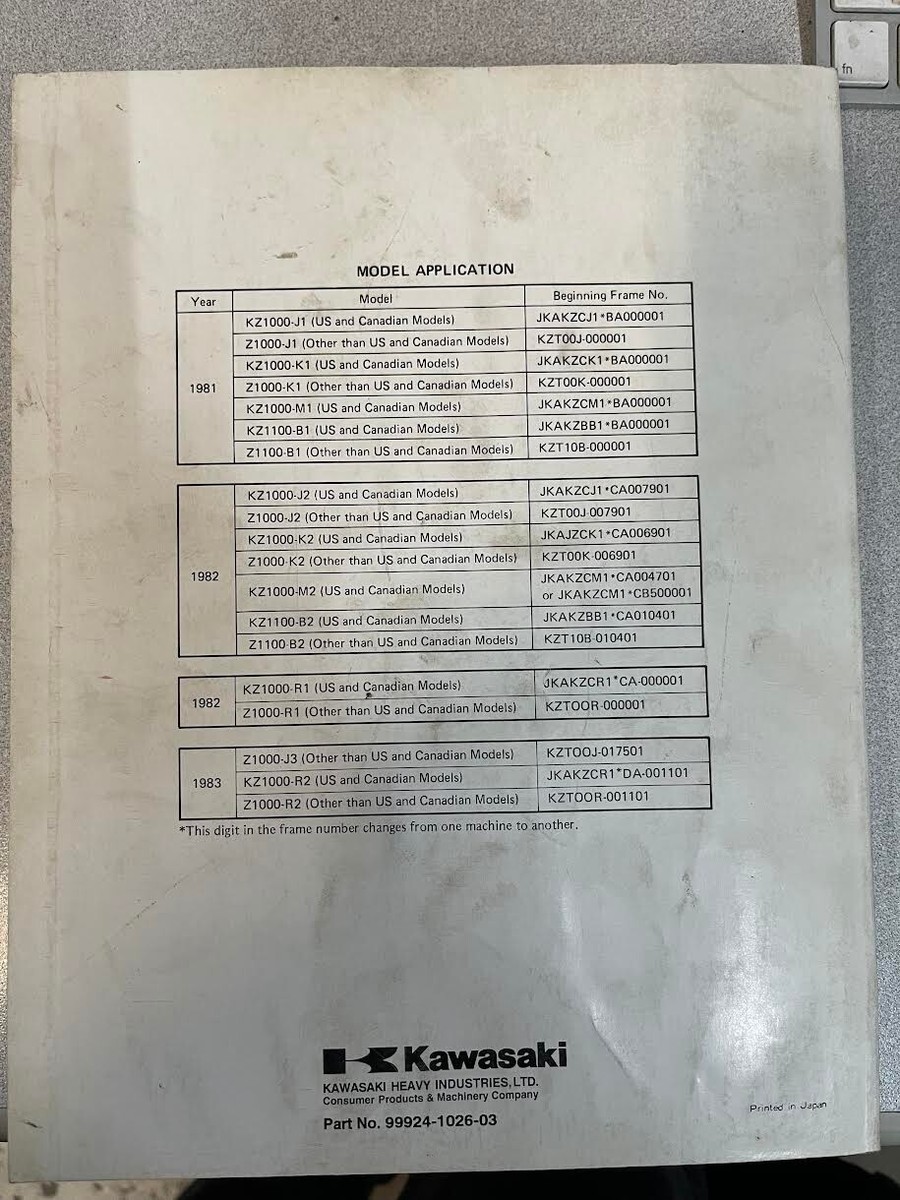 1981 1982 1983 Kawasaki KZ1000 KZ1100 Servizio Riparazione Manuale officina 99924-1026-03
