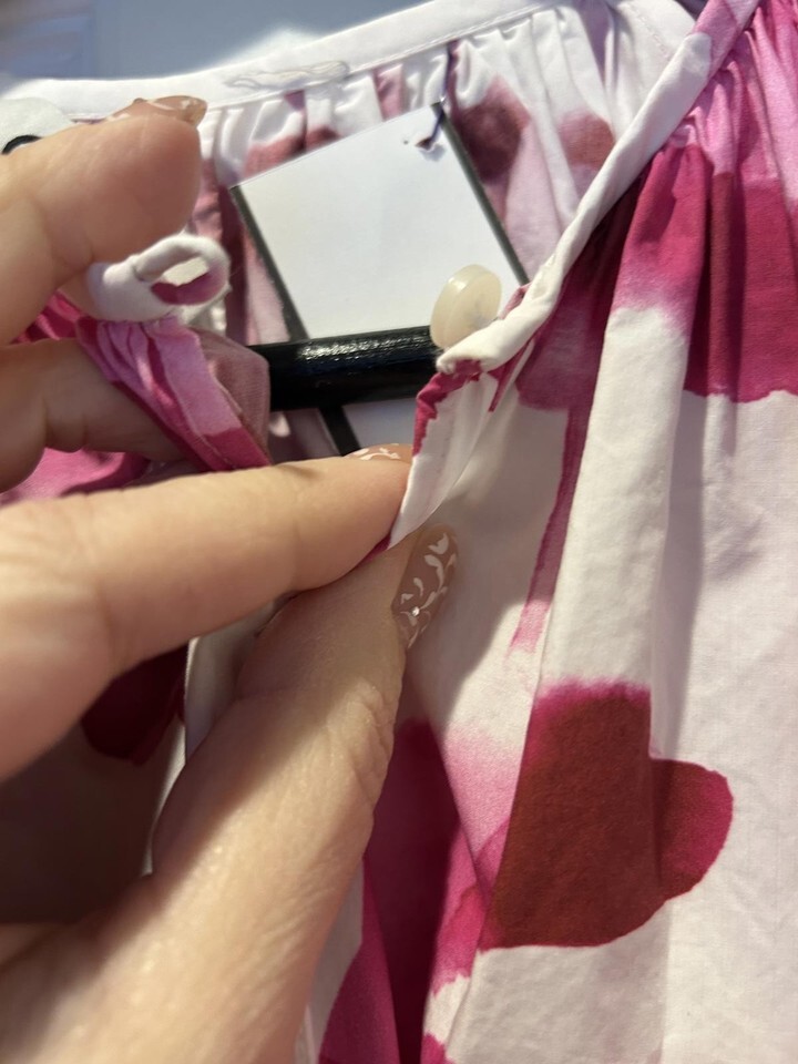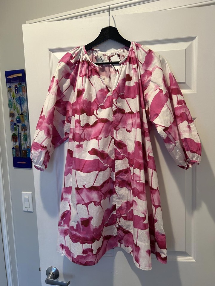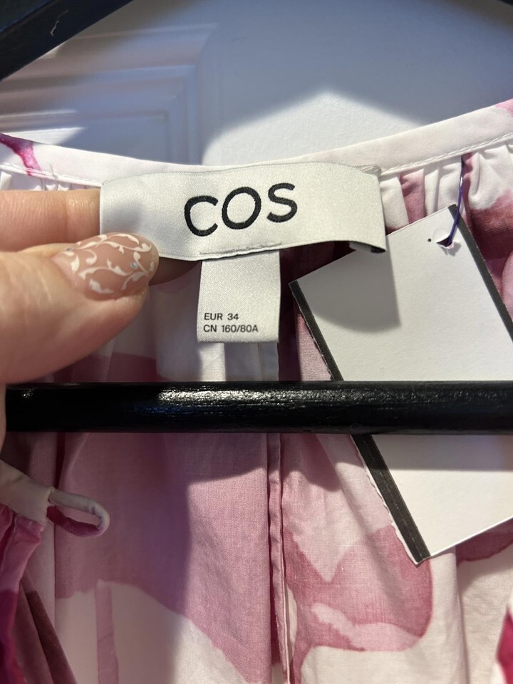 A stylish COS dress featuring a pink and white abstract pattern. The dress has a loose, comfortable fit with long sleeves and a gathered neckline. It includes buttons for closure and is perfect for casual or semi-formal occasions. Size EUR 34.