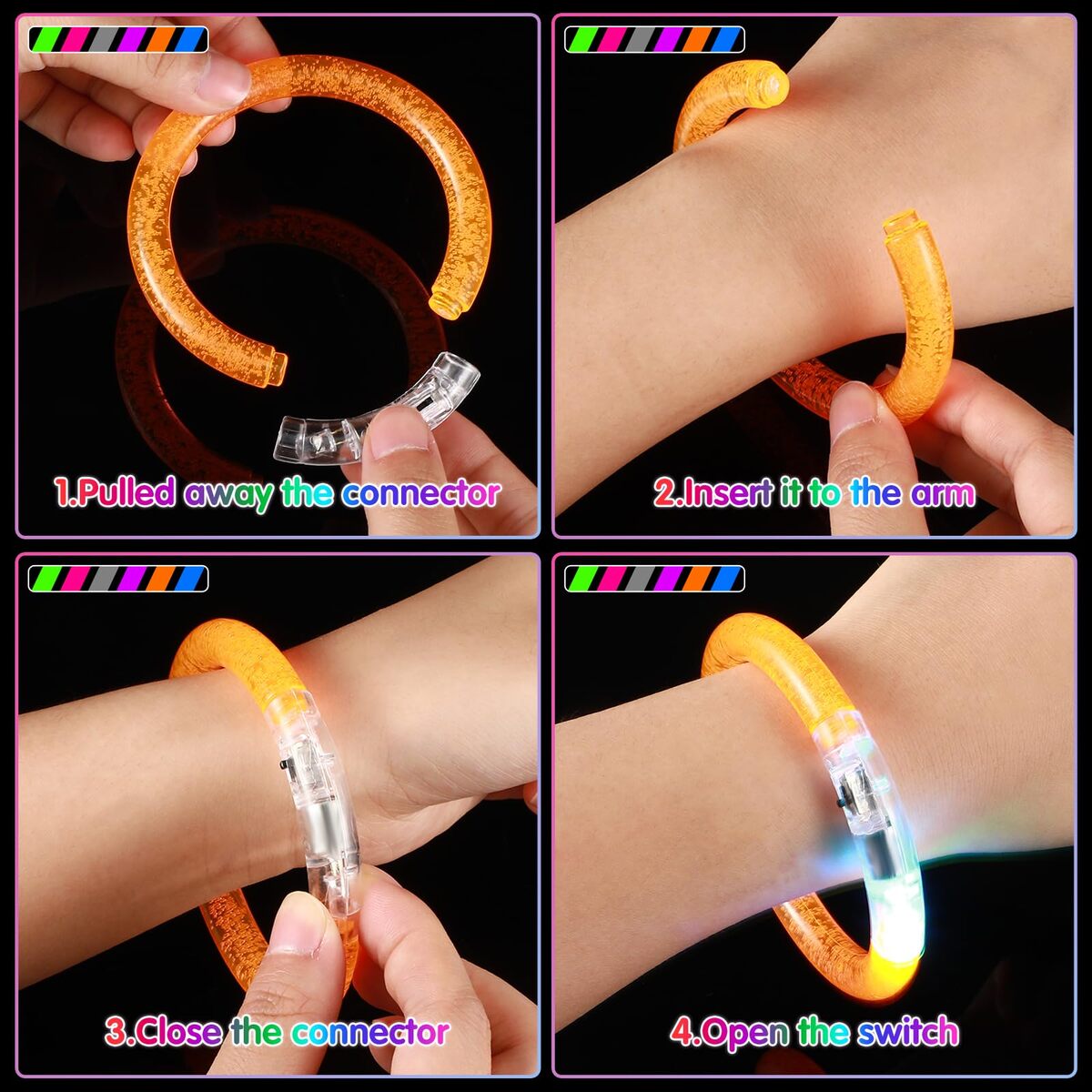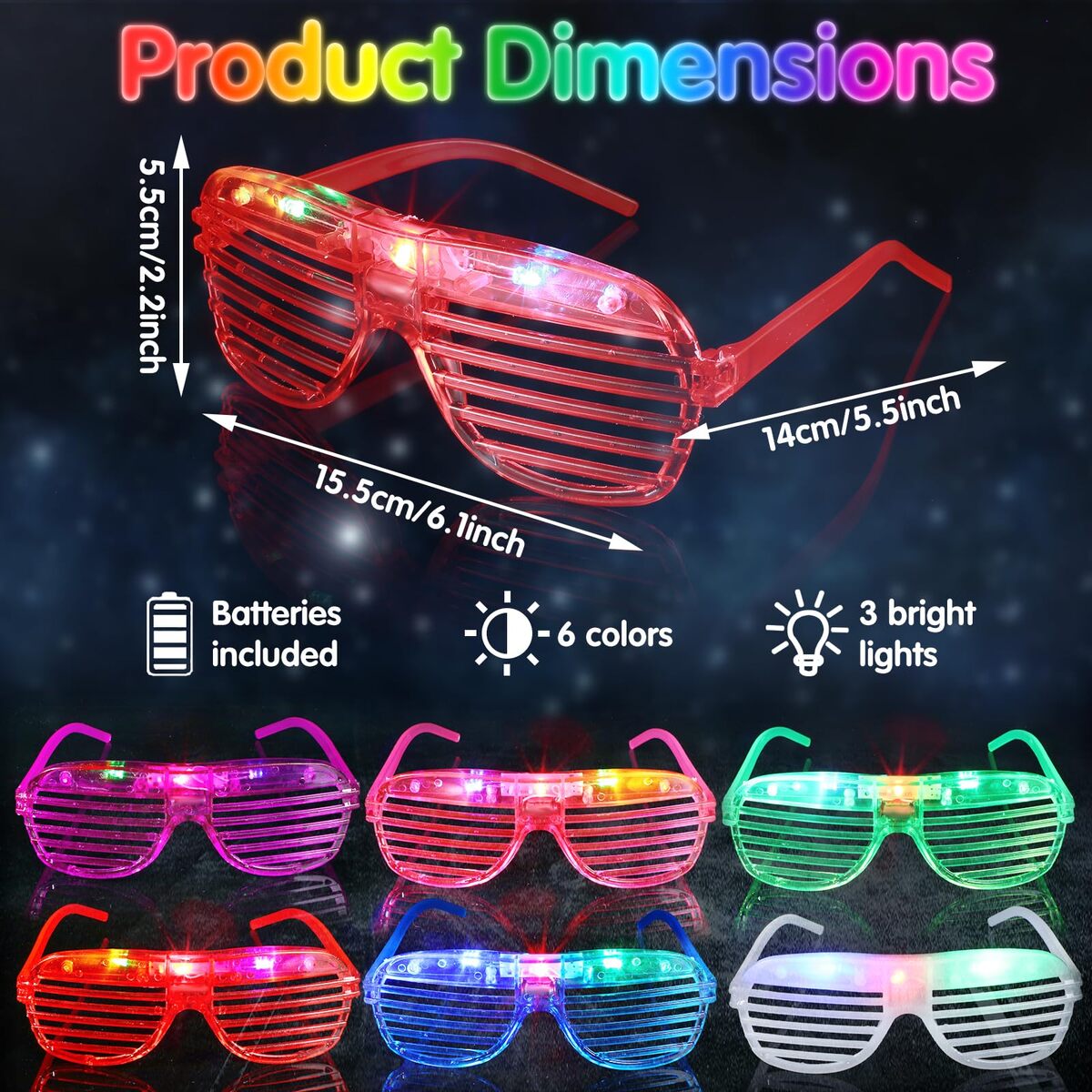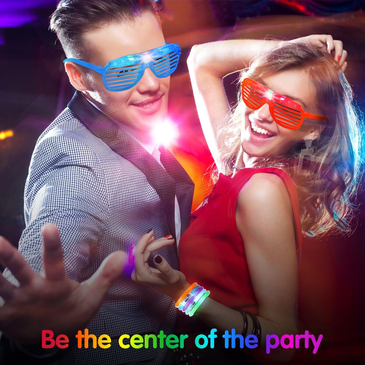 Package Include: you will receive 96 pieces of LED party favors, including 48 pieces of light up glasses and 48 pieces of glow bracelets; When you have a carnival with family and friends, the sufficient quantity can meet your mardi gras party needs,Safe and Reliable Material: the glow in the dark glasses are made of quality sturdy PC plastic, and the light up bracelets are made of thick and hard plastic; They all come equipped with 3 different LED flashing modes to suit the mood of your glow party,Suitable Size:Lens width of flash glasses is approx.6.1inches, hight 2.2 inches, temple length about 5.5 inches; The outside diameter of glow bracelets approx. 3.35 inches, and the inside diameter approx. 2.6 inches, the right size fits most people,and these LED neon flashing sunglasses will make your party attractive,Long Lasting: each pair of flash glasses has a switch and a plastic insert that you can remove and click a button in the middle of the glasses simply, and the glasses will start working, blinking and bright lights. These LED luminous neon shimmering sunglasses will add more fun to your parties,Wide Applications: our gifts are ideal for night events, outdoor concerts, neon parties, birthday parties, gift bag fillers, weddings, camping, dances, carnival parties and other celebrations such as July 4th Decorations,Independence Day, Halloween, Christmas