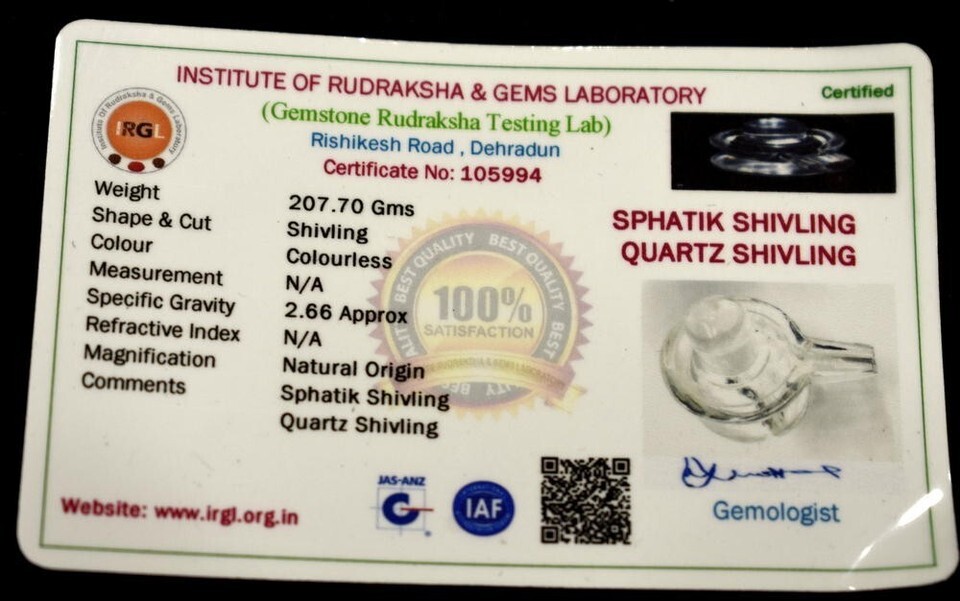 Sphatik Shivling / Quartz Crystal Shivlinga - 207 gms - Lab certified